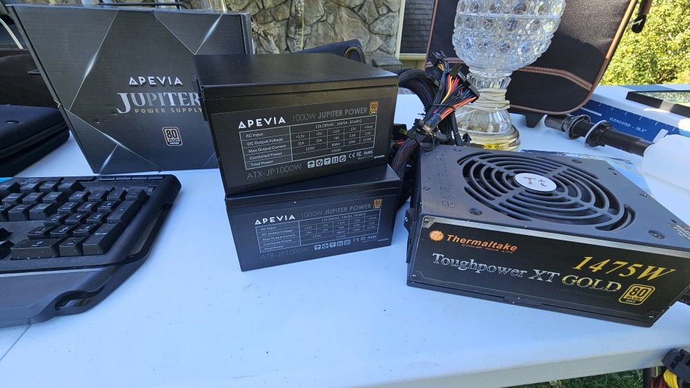 Apevia Jupiter 1000 watt power supply ×3 Thermaltake 1475W x1 Logitech G910 Orion Spark with ARC doc x1 Network card x1 Cisco systems Catalyst 2950 GPU Doc x1 Sennheiser headset x1