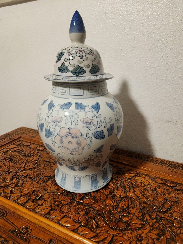 This vintage Chinese lotus ginger jar features classic blue-and-white hand-painted artwork with elegant lotus-inspired floral motifs and a domed lid topped with a pointed finial. The piece showcases traditional Chinese craftsmanship with stylized lotus petals, soft blue shading, and geometric borders around the neck. Crafted from glazed porcelain, this ginger jar has beautiful curvature, a smooth finish, and timeless decorative appeal.