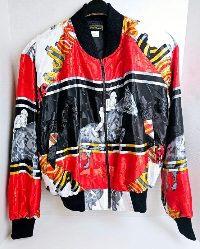 excellent condition PMB Horse Riding Equestrian Satin Bomber Jacket Womens Size L Red Gold Vtg 80s