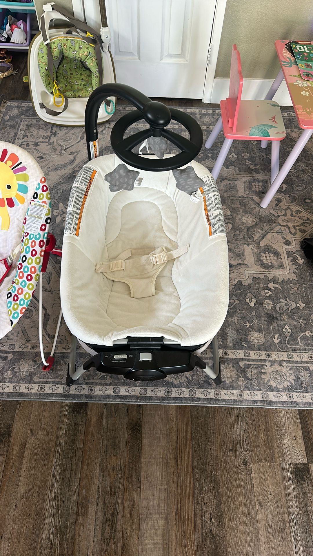 Baby items , I have a Graco 2 in one portable bassinet and play pin light weight vibrates 2 setting in good condition $25 Also have a baby bouncer missing the rail across. $7 I have a baby bouncer $20 Selling all together $35 weekend!