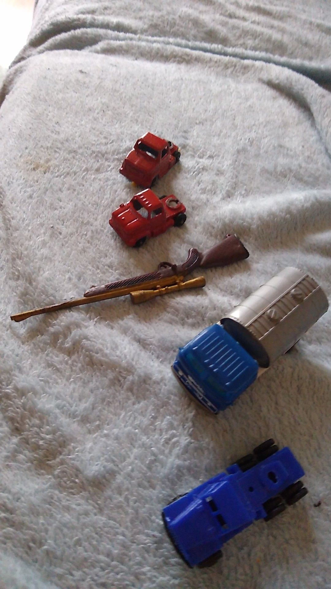 Old toys. The two red trucks are metal and the rest plastic