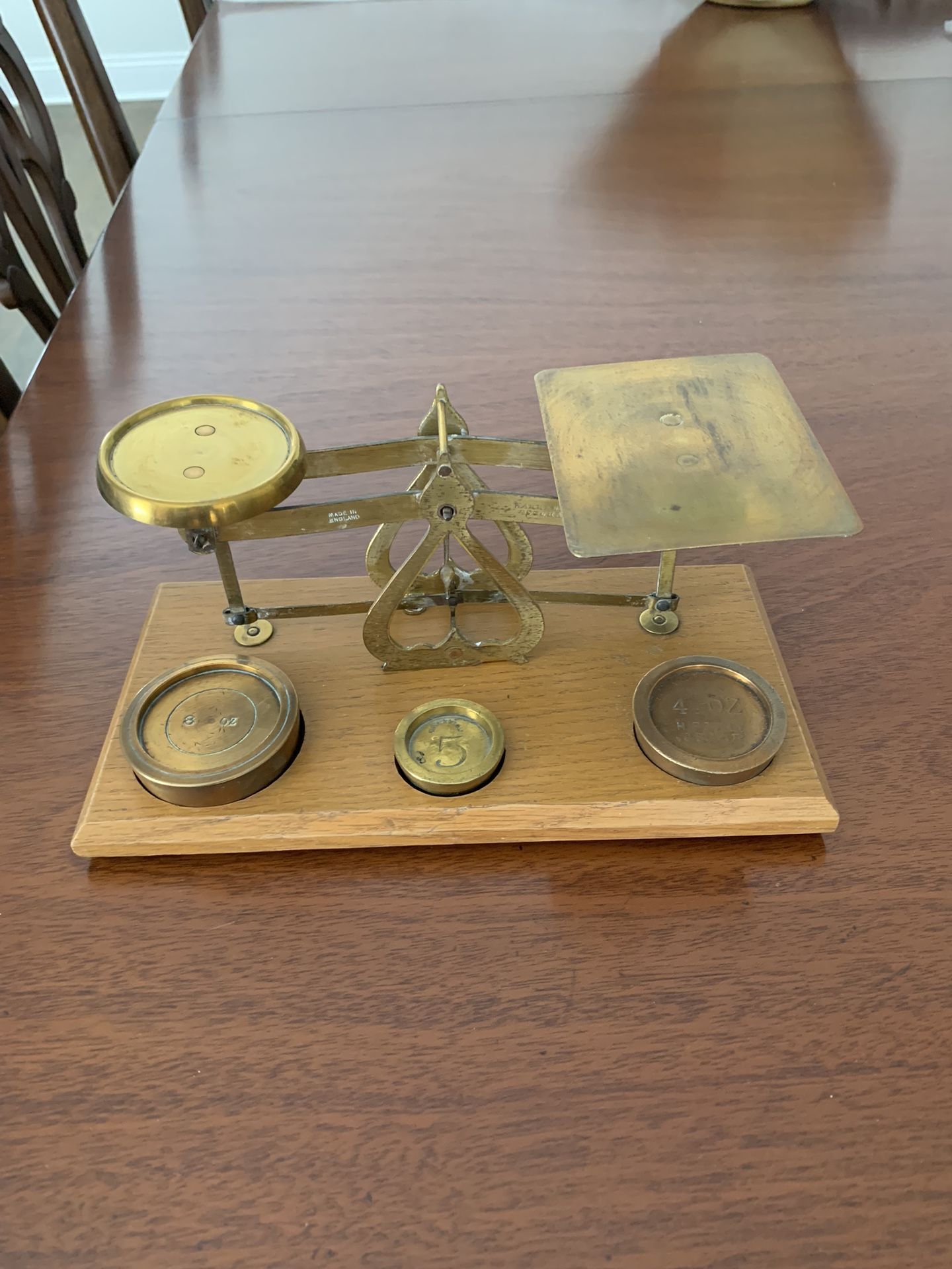 Antiques Brass Scale Made in England mounted on a Wood Base with Three Weights (4oz, 5oz and 6oz ) included. Collectible and an attractive piece that displays well with any decor.