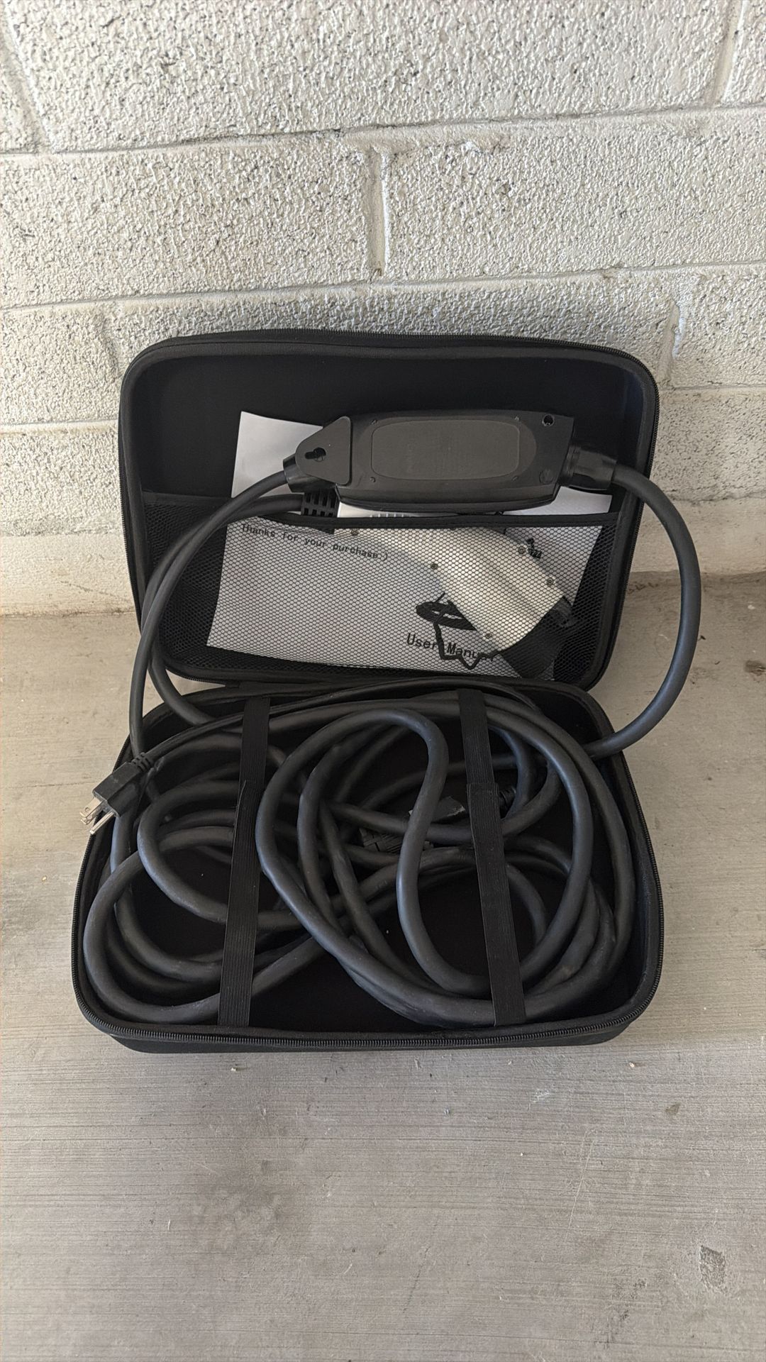 This item is a Duosida Level 1 and Level 2 Portable EV Charger. Charging Capability: Supports both Level 1 (120V) and Level 2 (240V) charging using interchangeable adapters. Speed: Charges up to 3x faster than a standard 120V charger. Amperage: Operates at 16 Amps. Cable Length: Features a 25-foot heavy-duty cable for extended reach. Uses a standard outlet (see picture). Comes with case for easy storage or traveling in your car. Clean and no dents, tears, or scratches. Barely used-as we had a charger in wall at home. Cross streets are Thomas and 56th Street.