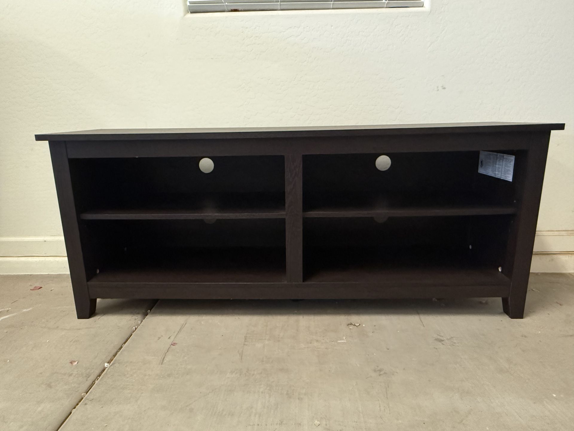 Dimensions: 58” (W) x 24” (H) x 16” (D) Features: Can fit 60-70 inch wide TVs with flush look Adjustable shelves Open storage for consoles and media Cord management holes Supports up to 250 lbs Condition: Smoke free and pet-free home No major scratches or damage Sturdy and fully assembled