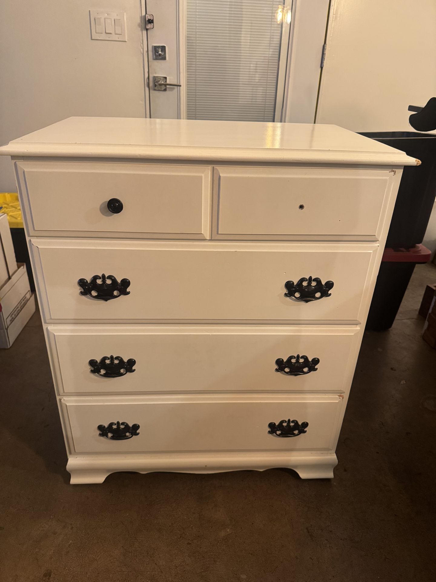 White dresser. 34 inches tall/30 inches wide. Top right knob came off and can’t figure out how to fix it. Probably just needs a washer. Some damage on corners as pictured. Pick up only. Cross streets 18th Ave & Osborn.