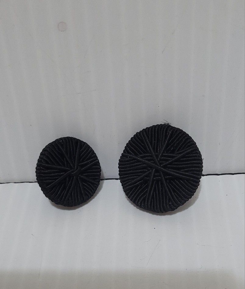 Add a touch of vintage charm to your sewing project with this beautiful handmade passementerie button. With a classic black color and a geometric shape, this button is perfect for adding a sophisticated touch to any garment or craft project. Made from high-quality gimp cord material, this button is durable and long-lasting. Measuring 0.5" and 1.0" diameter, this vintage original button is perfect for a variety of applications. Whether you're a collector of vintage sewing buttons or a creative crafter looking for a unique embellishment, this button is sure to impress. Handmade with care and attention to detail, this button is a true work of art. Both buttons are in perfect condition. They look like new.