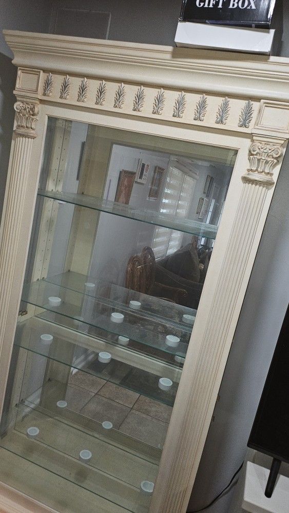 Havertys curio cabinet in a blond finish. There are three glass shelves inside with mirrored back. It is lit as well. 44"wide x 15"deep x 82"high . A set of two cabinet