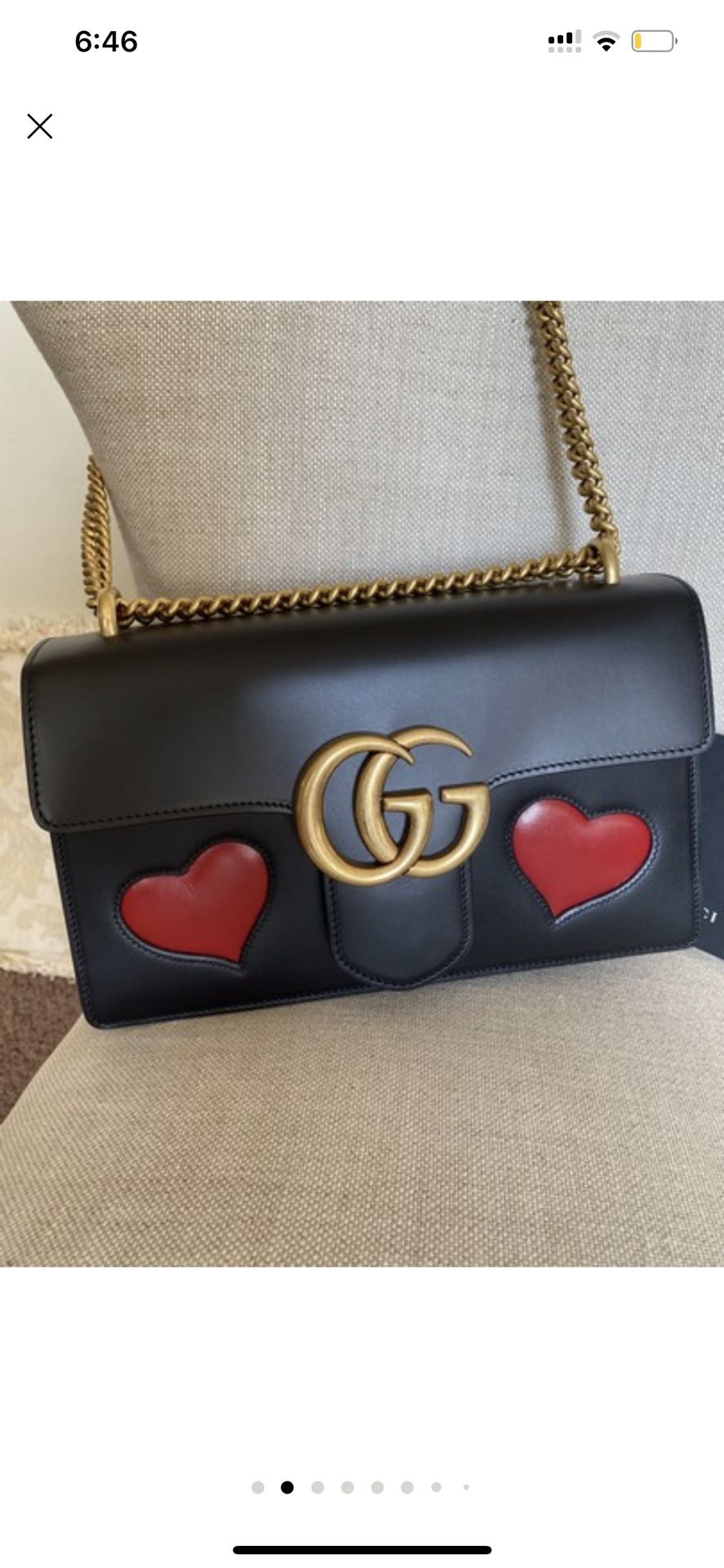 This Medium GG Marmont Black Red Hearts Antique Gold Chain and Hardware is extremely Rare sold out immediately! Brand New never worn only used for pictures! Black leather with embedded Red Hearts. Back of Bag gorgeous detail as well. Cotton Linen lining. Made in Italy
