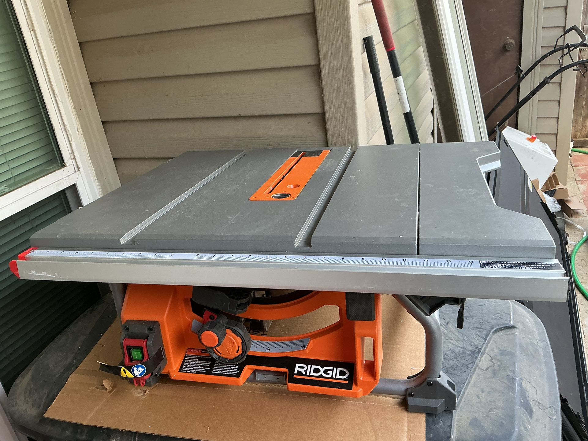 RIDGID 10-inch corded table saw. Comes with the folding stand and accessories shown. Saw is used but fully functional. Specs / Features: • 15 Amp motor • Folding stand included • Adjustable bevel 0°–45° • Onboard storage for accessories • Standard 10” blade compatibility • Rip fence and guards included (shown in packaging)