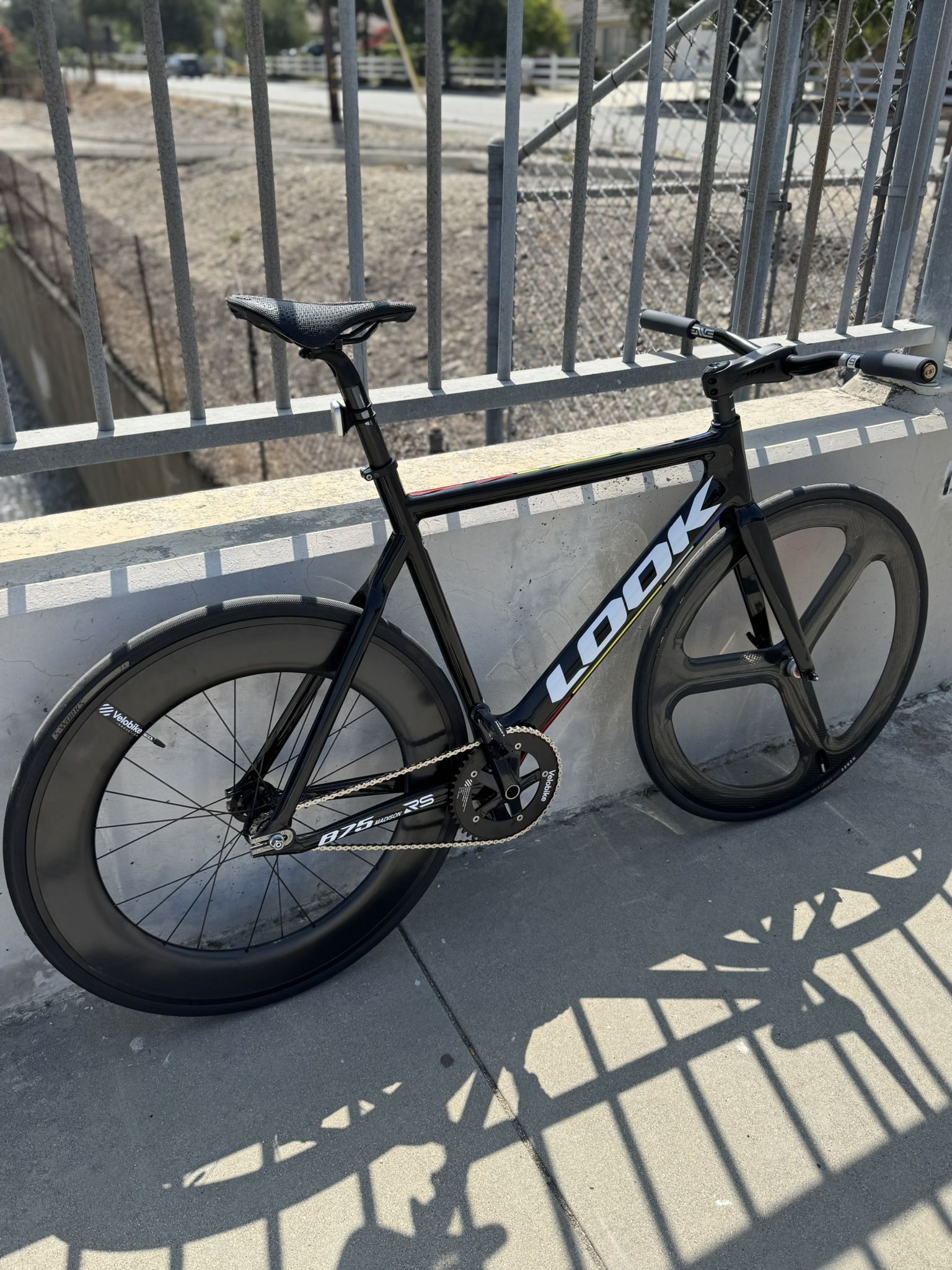 Look Madison 875rs Sugino 75dd 165mm Hed trispoke clincher Hed 90mm clincher Zipp sl sprint stem 90mm Enve riser bars Specialized mirror saddle