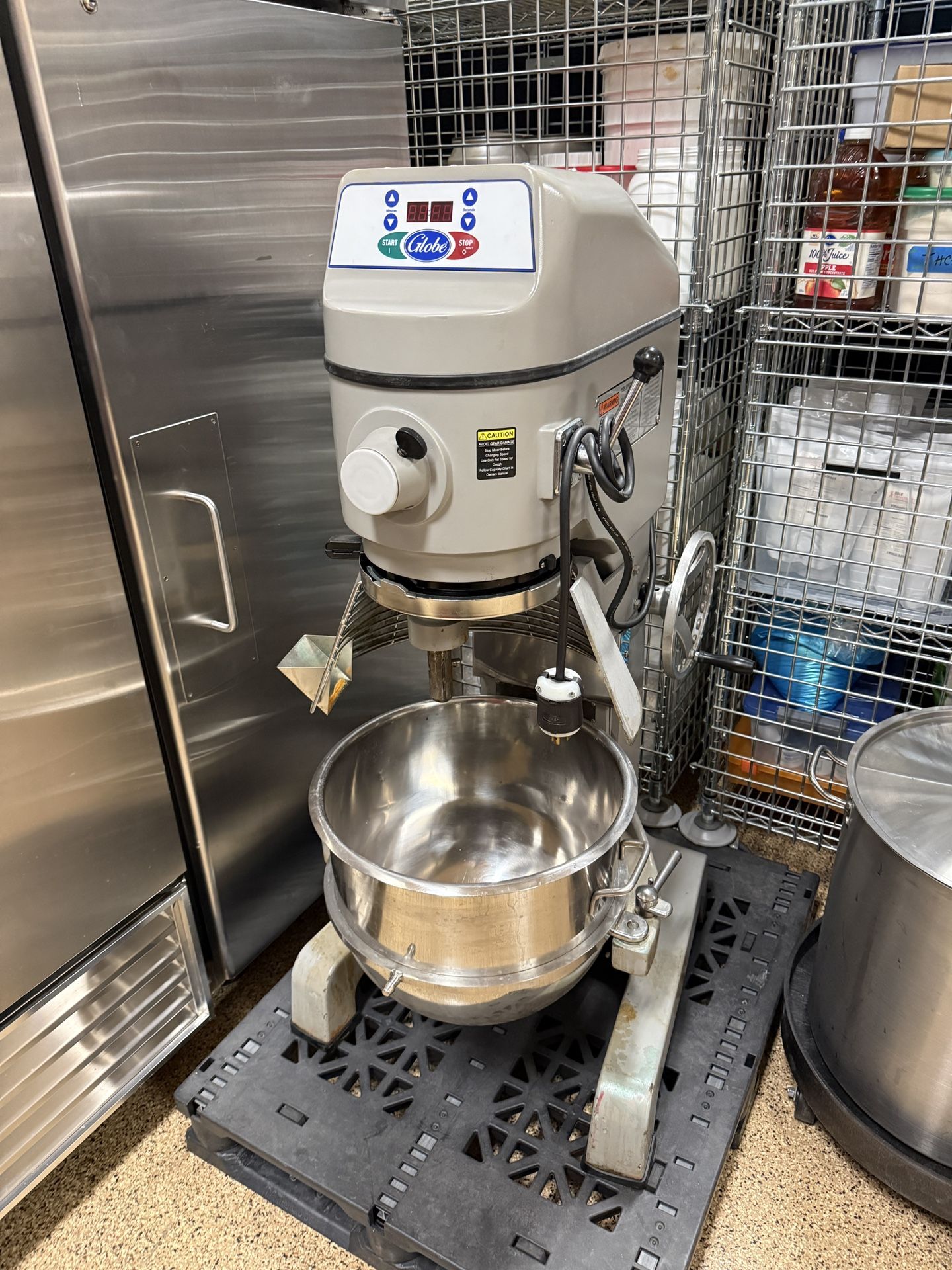 Globe SP40 commercial stand mixer with 40 qt. stainless steel bowl with multiple attachments (wire whip, spiral dough hook, flat beater) and bowl guard with ingredient chute. 2HP 3 speed gear driven motor with digital timer. NSF certified. 208V, 3 Phase