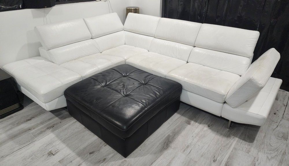 116 inch long, 2 piece, L shapped, real white leather, chrome legs, backs and sides are adjustable up and down, very heavy, sofa, couch, loveseat, sectional, modern furniture, clean, no damage. Black leather storage ottoman available seperate.