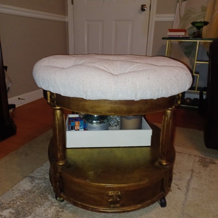 All wood table that has been modified into an ottoman. It is beautiful with nail heads and a gold finish.