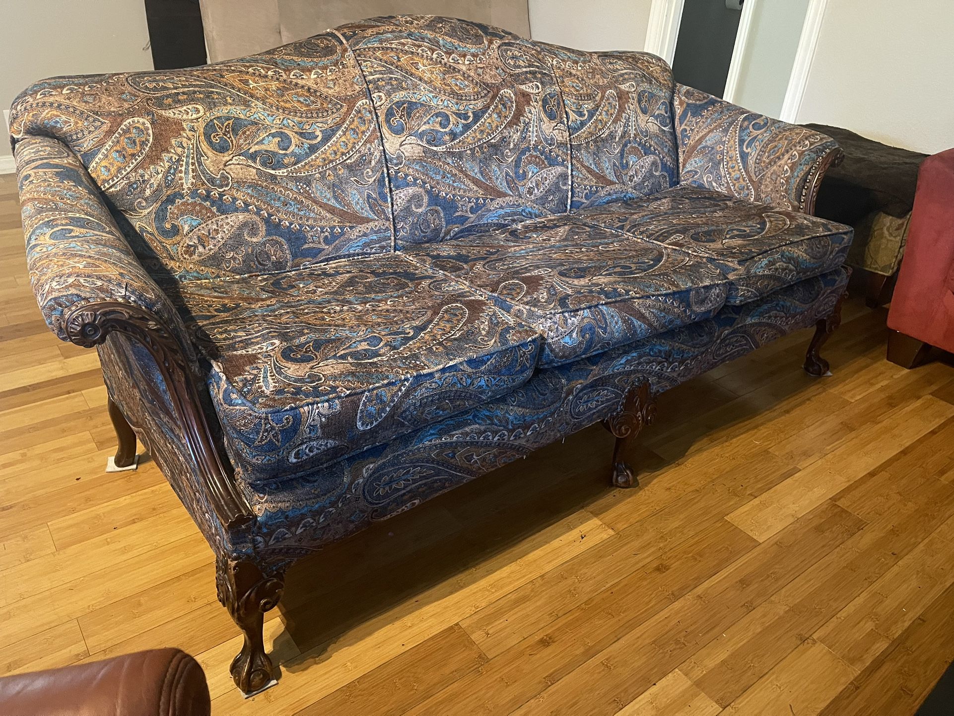 Unique vintage comfy couch for sale, from a pet/smoke free home. Custom wood worked trim. It has an almost pearlescence sheen to it. Shoot me an offer. Footprint: 6' x 2'5" 3' tall 3' deep