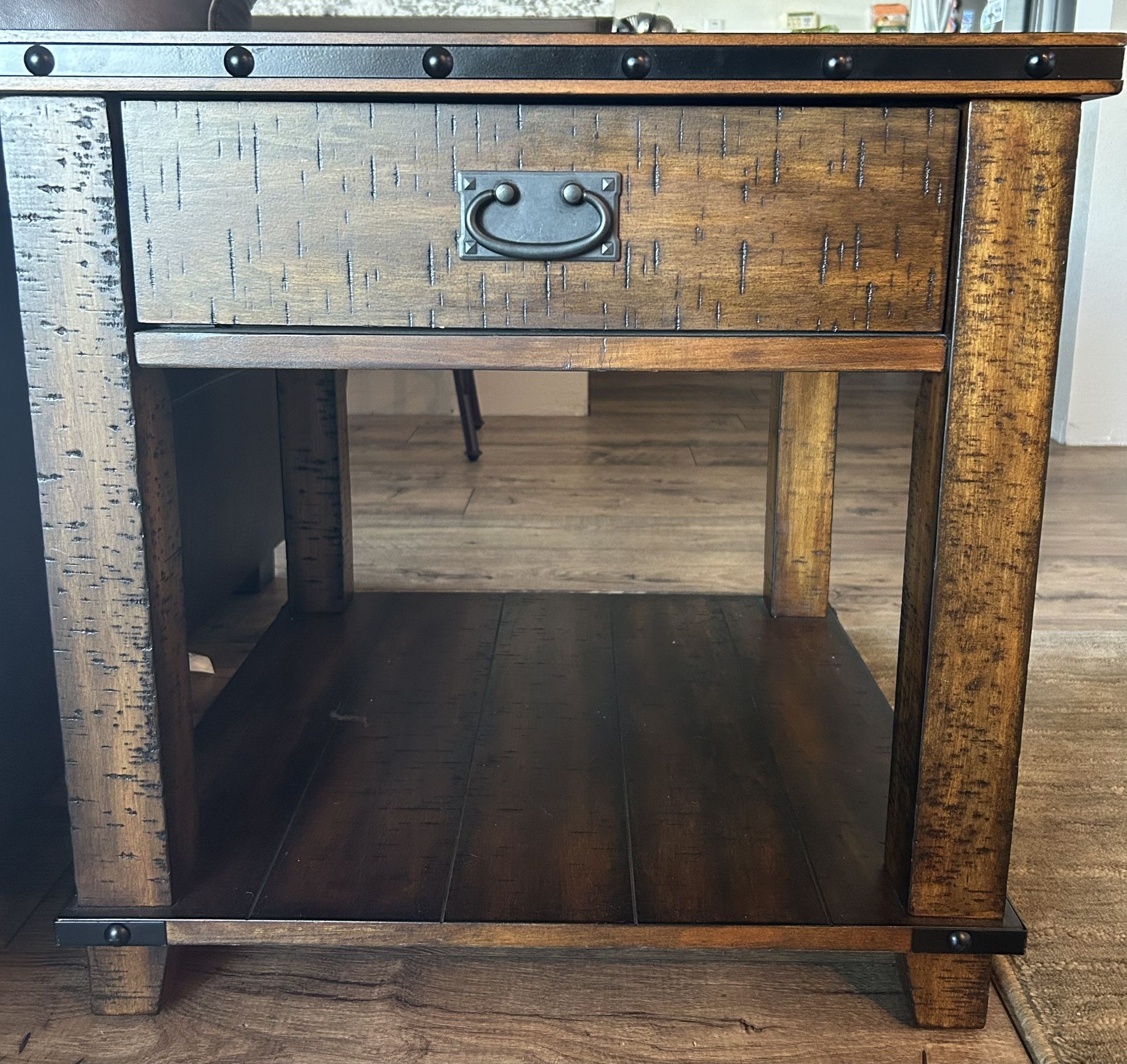 Payment only through OfferUp, Venmo, Apple Pay or Zelle. Rustic Wood End Table with Iron Accents In very good condition, like new.