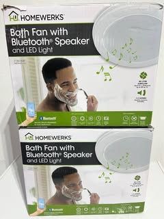 Two for $125 or best offer, 80 CFM bathroom exhaust fans with Bluetooth speaker and white LED light, $125 for both Or $65 just one, Recommended for rooms up to 80 square feet. The ceiling-mounted bathroom fan quietly removes moisture at 1.5 sones. Mounting hardware included. Easy adjustment. No-cut housing requires no attic access for installation. Brand new in unused boxes. Valued at $108.64 each.