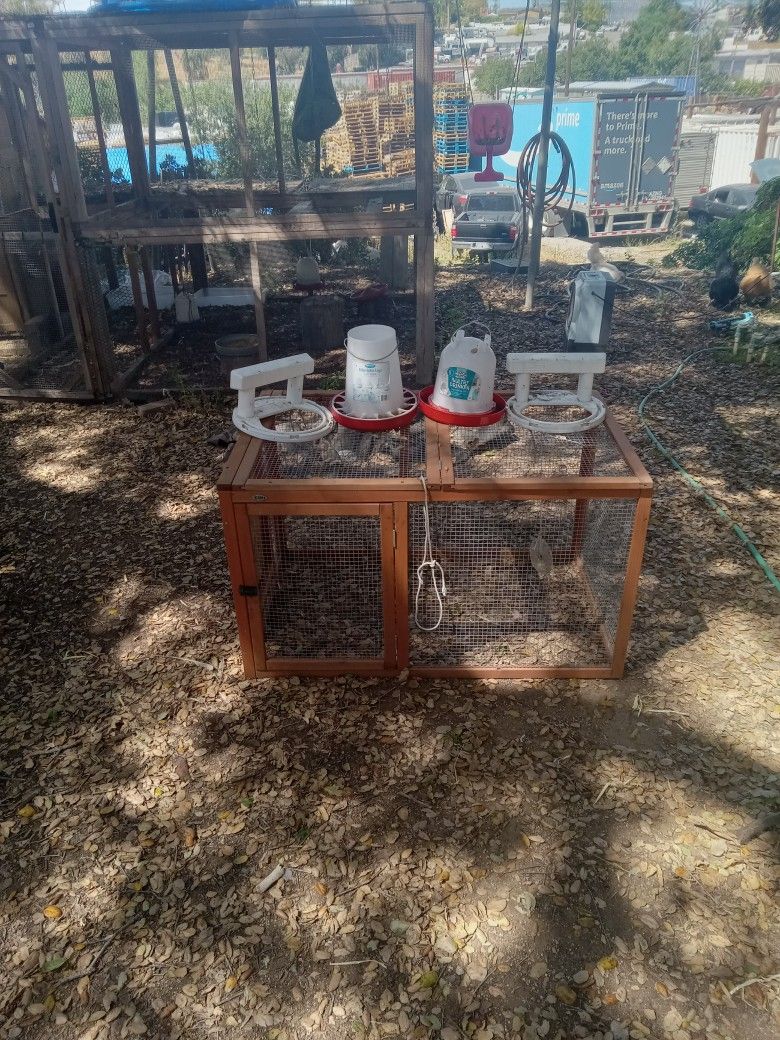 Small chicken run good for separation or cleaning. Barely used water and feed buckets, and 2 roots that can be attached to buckets.