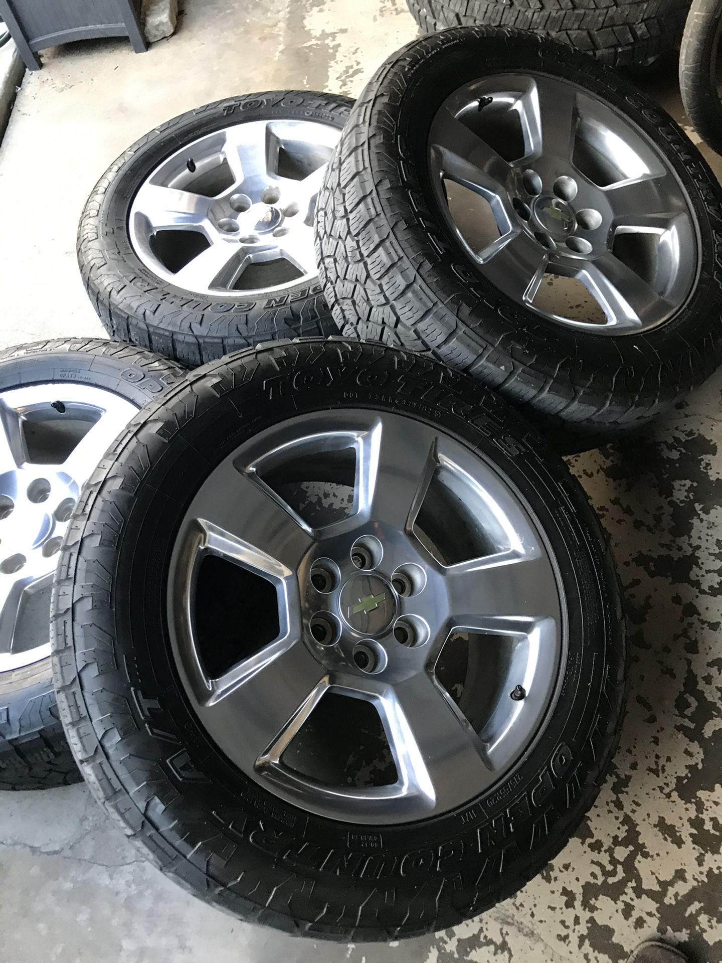 Chevy wheels 20” 6Lug on Toyo 275/55/20 with 90% life all around - no clear pealing on wheels Great condition - no cracks or repairs $1050 Firm