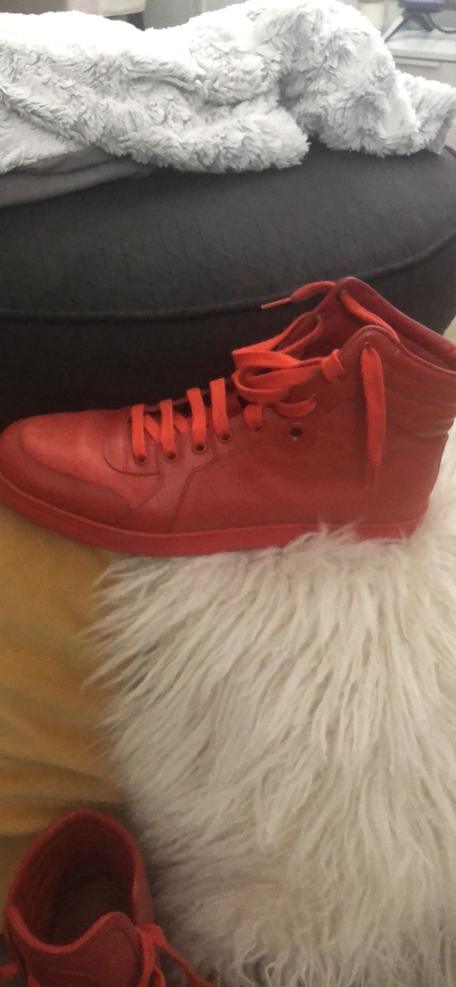 Like New!!!!! High End Designer. “Gucci” Red Leather Hilary Lux Diamanté High-Top Sneakers. Comes with original box, dust bag and extra red shoe strings.