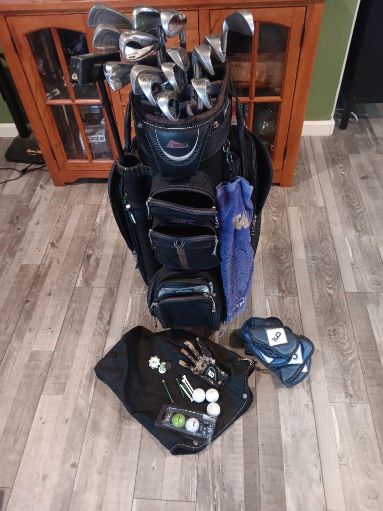 All used items. Bag comes with clubs, towel, club covers, tees, glove (small), ball markers. The bag is a datrek cart bag with 14 club divider. Built in cooler and umbrella holder.