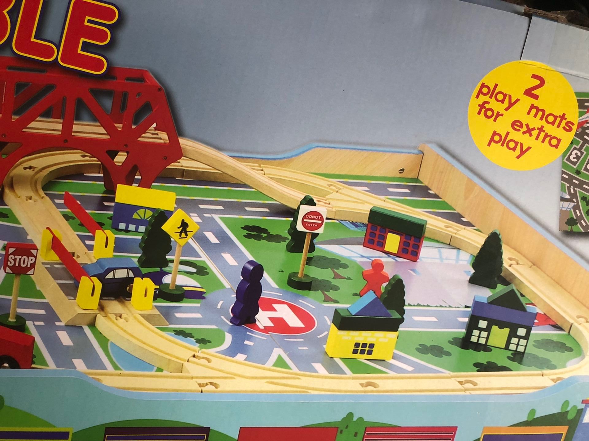 Fun train table colorful and sturdy Create hours of imaginative play Includes: Table, Reversible helicopter/farmer play mat, Over 50 play pieces and drawer to hold all pieces. Assembled table size: 30.75 inches length 22.5 inches width 13.5 inches height