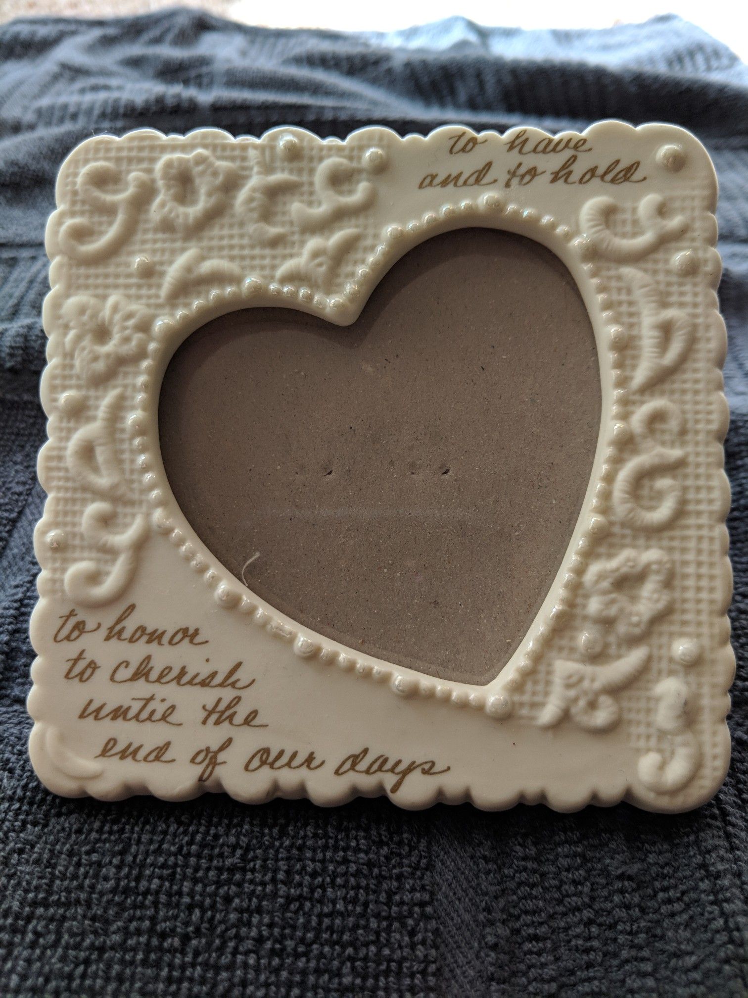 Brand New Wedding Frame It says "To have and to hold, to honor to cherish until the end of our days". Approx. 4" x 4". Inside the heart is approx. 2 1/2" x 2 1/2".