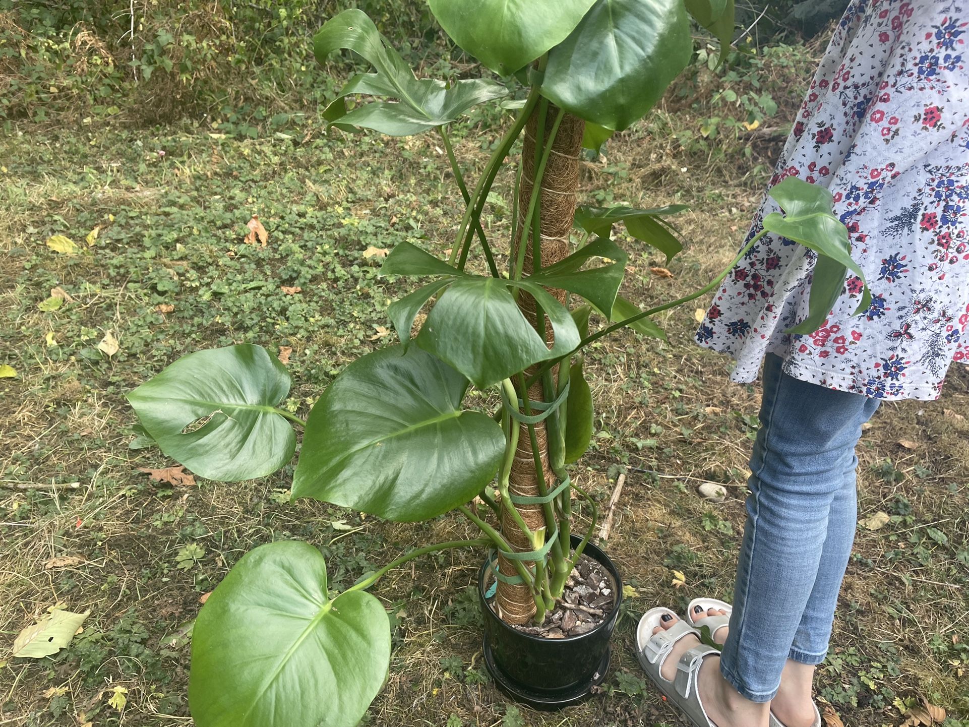 Monstera Deliciosa 39 1/2 inches from pot to bottom Comes with 3 moss poles and in pot Large leaves with fenestration Grown from home from baby plant