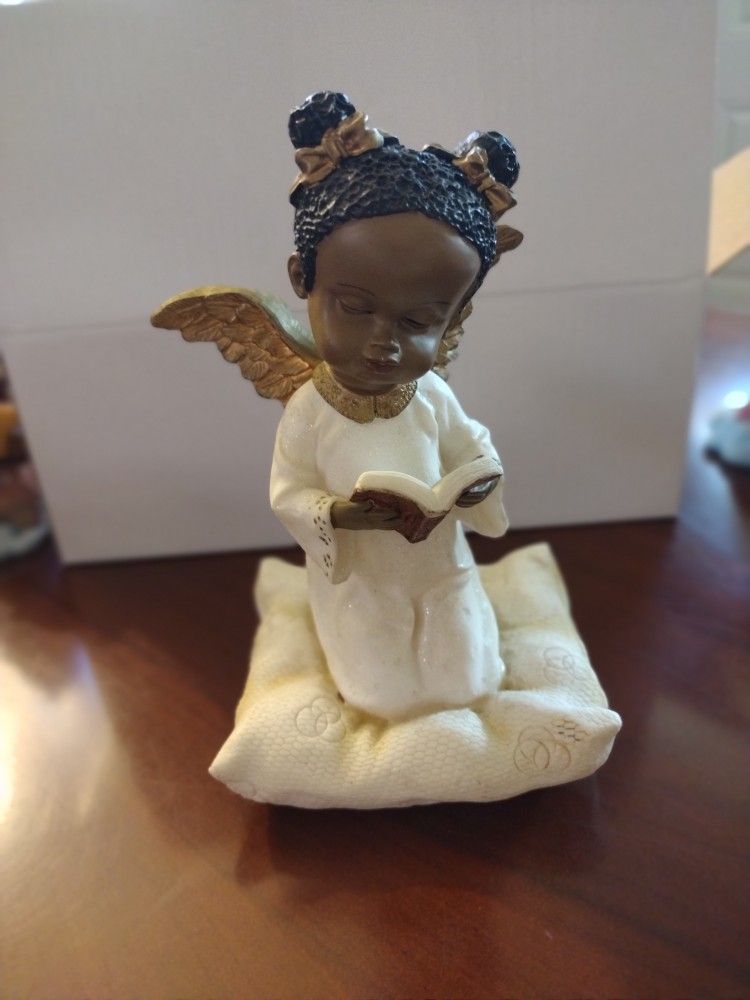 Antique Collectible Adorable Angel With Pigtails All In White With Gold Wings, Reading The Bible.