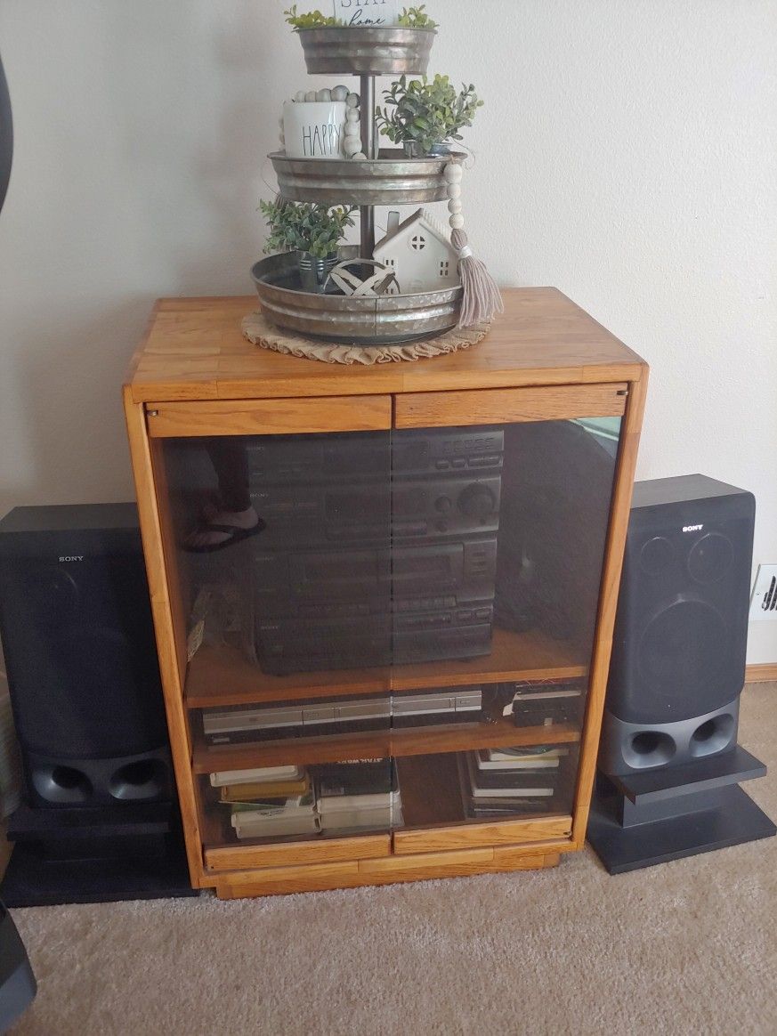 Heavy solid cabinet with a Sony radio, Cassette, multiple CD slots. Used but still great condition. Selling all together.