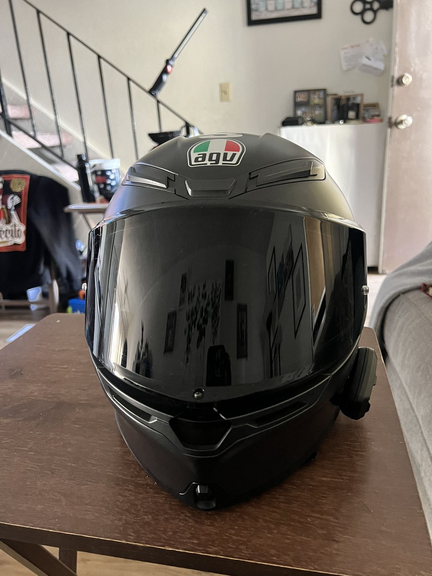 Comes with smoke visor that has the pin lock the clear visor and dust bag. Has a small nick on the wing as seen in pic comes with the Cardo spirit hd. Never wear any of my helmet with out balaclava 350$ obo pick up only