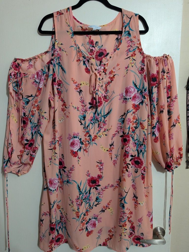Brand: Boutique $12 Size: 2x Color: pink Condition: like new Style type: dress with cold shoulder ties on sleeves, has slip with dress Flaws: none Like new condition Cash, Card with $1 fee, cash app only. (Cash please have exact amount) Prices are firm. Non smoking house.