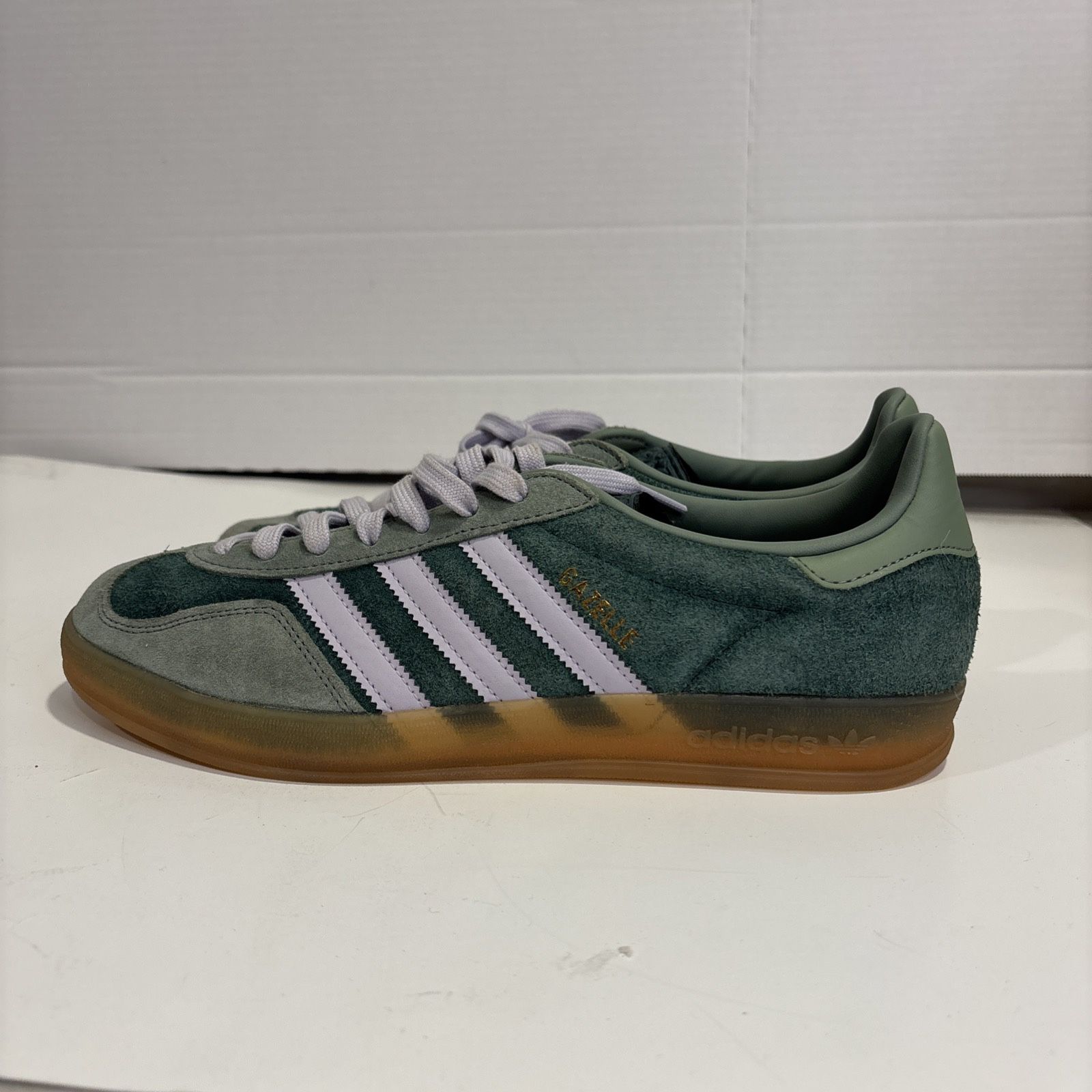 Adidas Gazelle Indoor in the "Mineral Green Silver Dawn" colorway