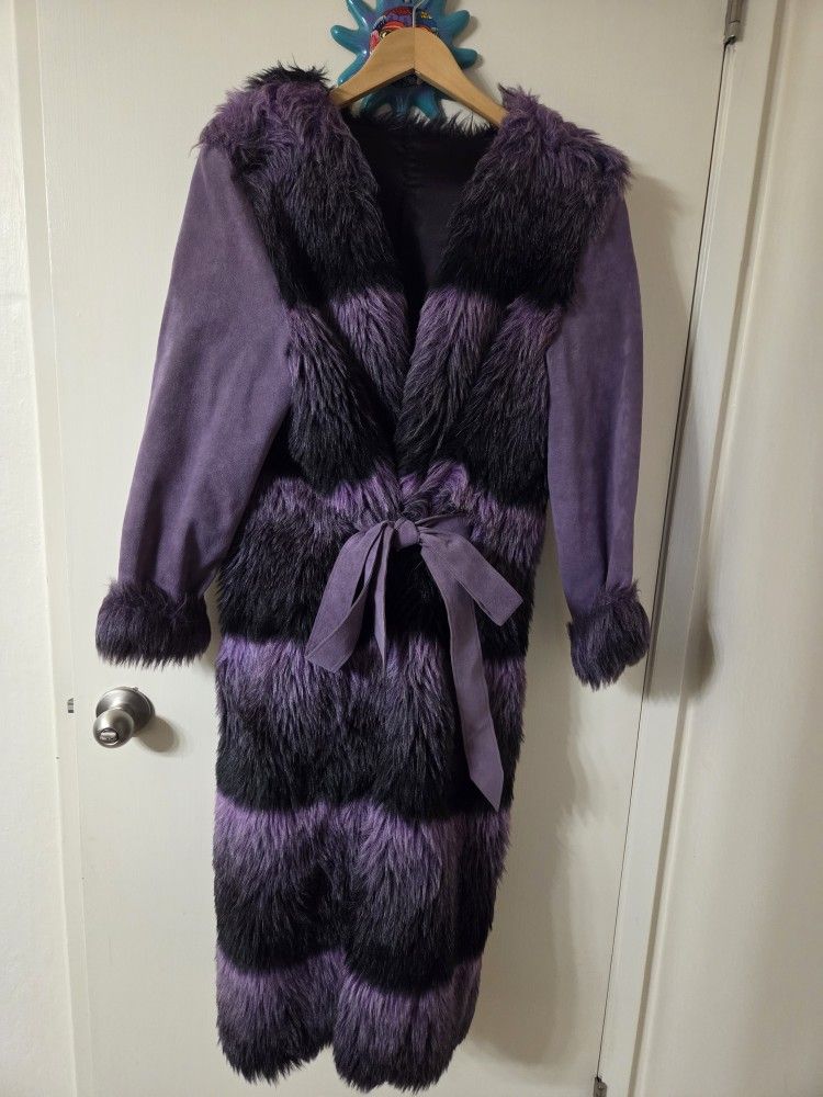 Women’s Faux Fur & Suede-Style Coat – Purple & Black Eye-catching women’s statement coat featuring plush faux fur paneling in rich purple and black tones with soft suede-style sleeves. Comes with a matching waist tie for a flattering, adjustable fit. Warm, stylish, and perfect for fall and winter. Details: • Material: Faux fur body, suede-style fabric sleeves • Color: Purple & black • Length: Long / knee-to-mid-calf • Belted waist tie • Fully lined • Soft fur trim at sleeves Condition: Very good pre-owned condition. Clean, well-kept, no rips or stains. See photos for details. Perfect for cooler weather, special occasions, or anyone who loves a bold, fashionable look.