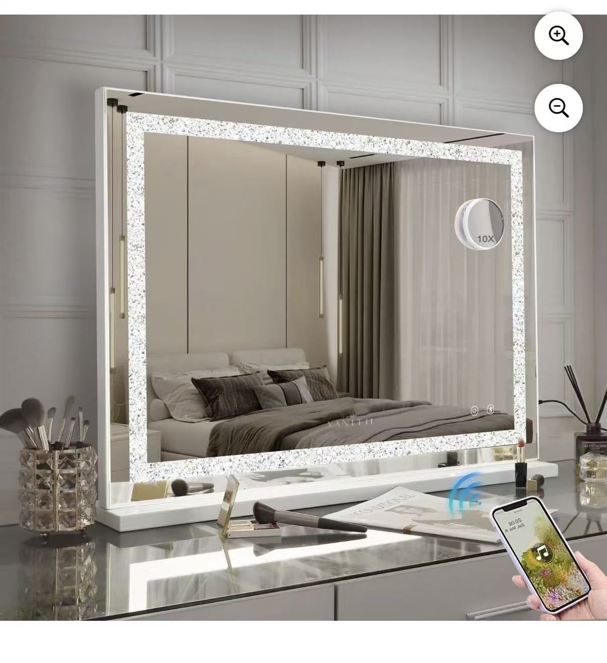 Large Size & Crystal-Cut LED Strip Design 32" x 23". Featuring a crystal-cut LED strip, this mirror creates a dazzling, diamond-like sparkle that enhances brightness and adds a luxurious touch to your vanity. • Bluetooth Function & USB Charging Port The vanity mirror comes with Bluetooth and a USB port for phone charging. You can listen to music and charge your phone while doing your makeup. • Adjustable Brightness & 3 Light Settings There are 3 different light settings for the vanity mirror, with the ability to dim and brighten each one: daylight, warm light, and cold light. • Detachable Mirror Base & Wall-Mounted Option The mirror base can be removed, allowing you to mount the mirror on the wall as well. • 10X Magnification for Precision Includes a detachable 10X magnification mini mirror, perfect for detailed makeup, eyebrow shaping, and skincare. • A Thoughtful Gift for Makeup Lovers An ideal holiday or birthday gift for daughters, granddaughters, and loved ones, combining elegance and practicality.