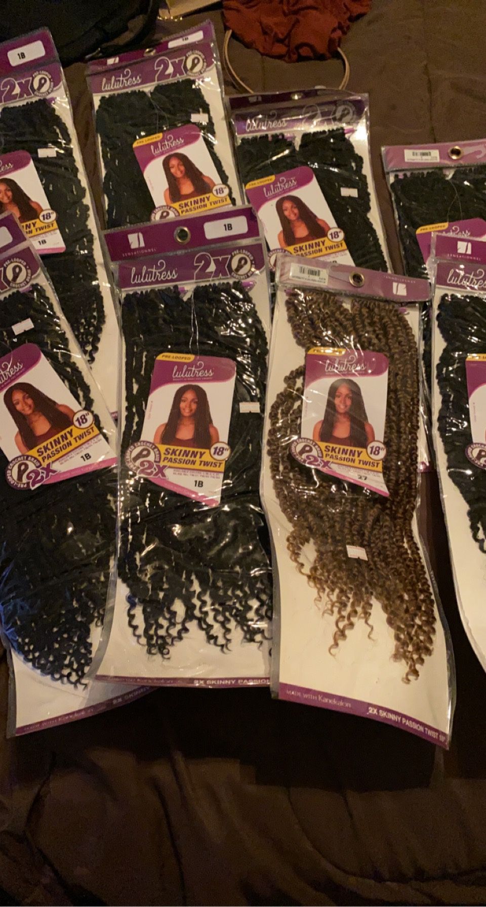 8 packs of lulutress skinny passion twists; length is 18 inches; 7 packs are in color 1b one pack is in the color 27; all packs are in new condition; never been open or worn; 20 strands in each pack so 160 strands in total for the bundle