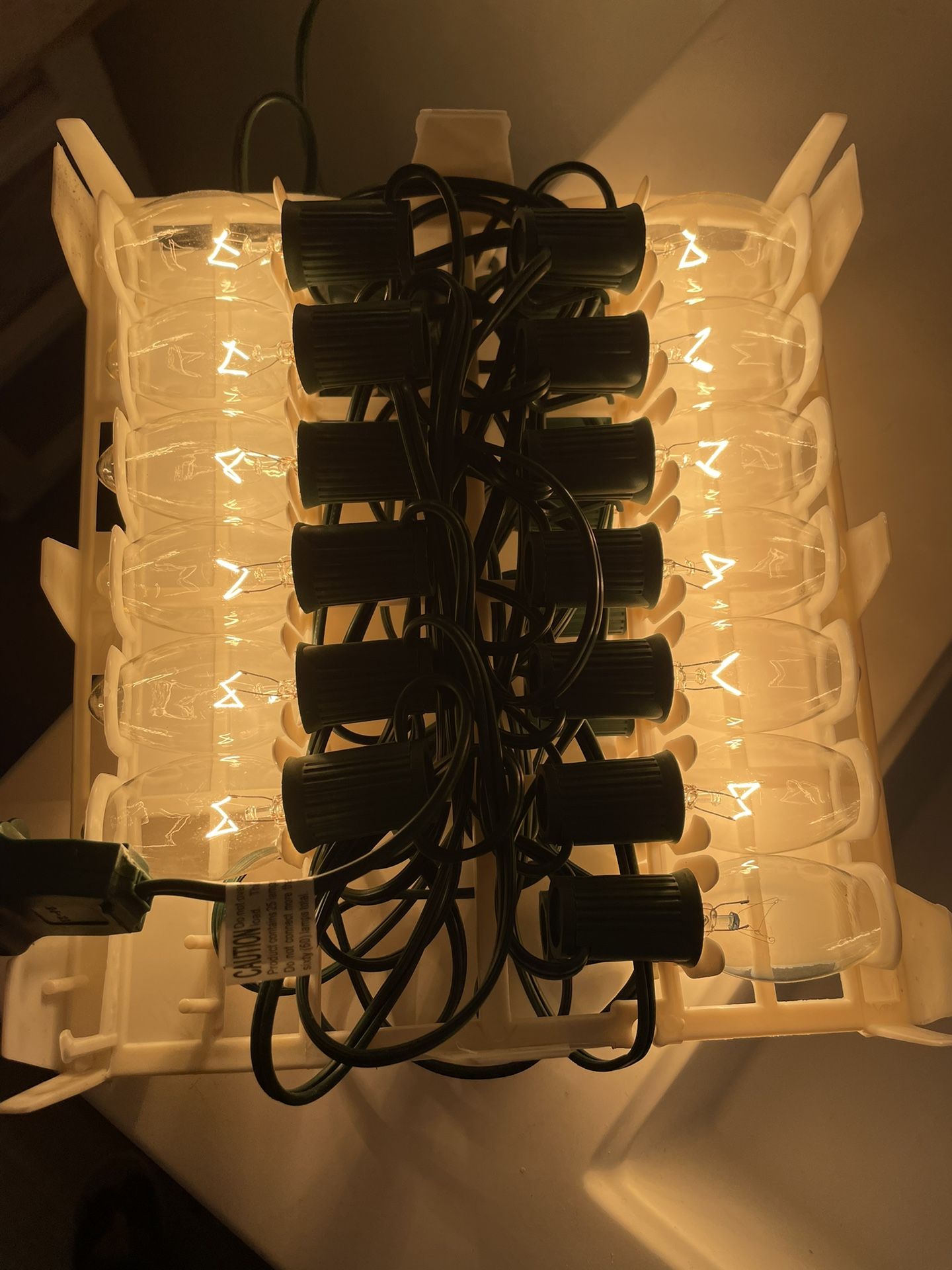 I have some boxes of holiday string lights, brand new. They have a really pretty warm, white light and are very bright. Good for indoor and outdoor use with clear bulbs, green wire, and plugs at both end. One box for $8 Two boxes for $14 Three boxes for $20