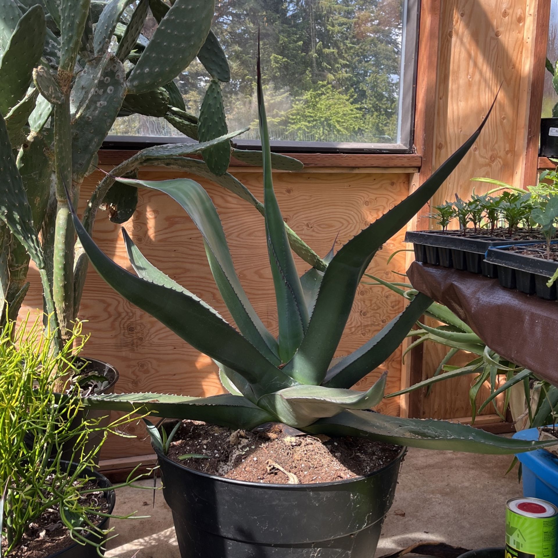 Beautiful and healthy Century Agave. I have a toddler now and am so worried about him around this plant. She’s very happy and has been kept in my greenhouse for the last two years. Before that she enjoyed time inside. New pups already poking out.