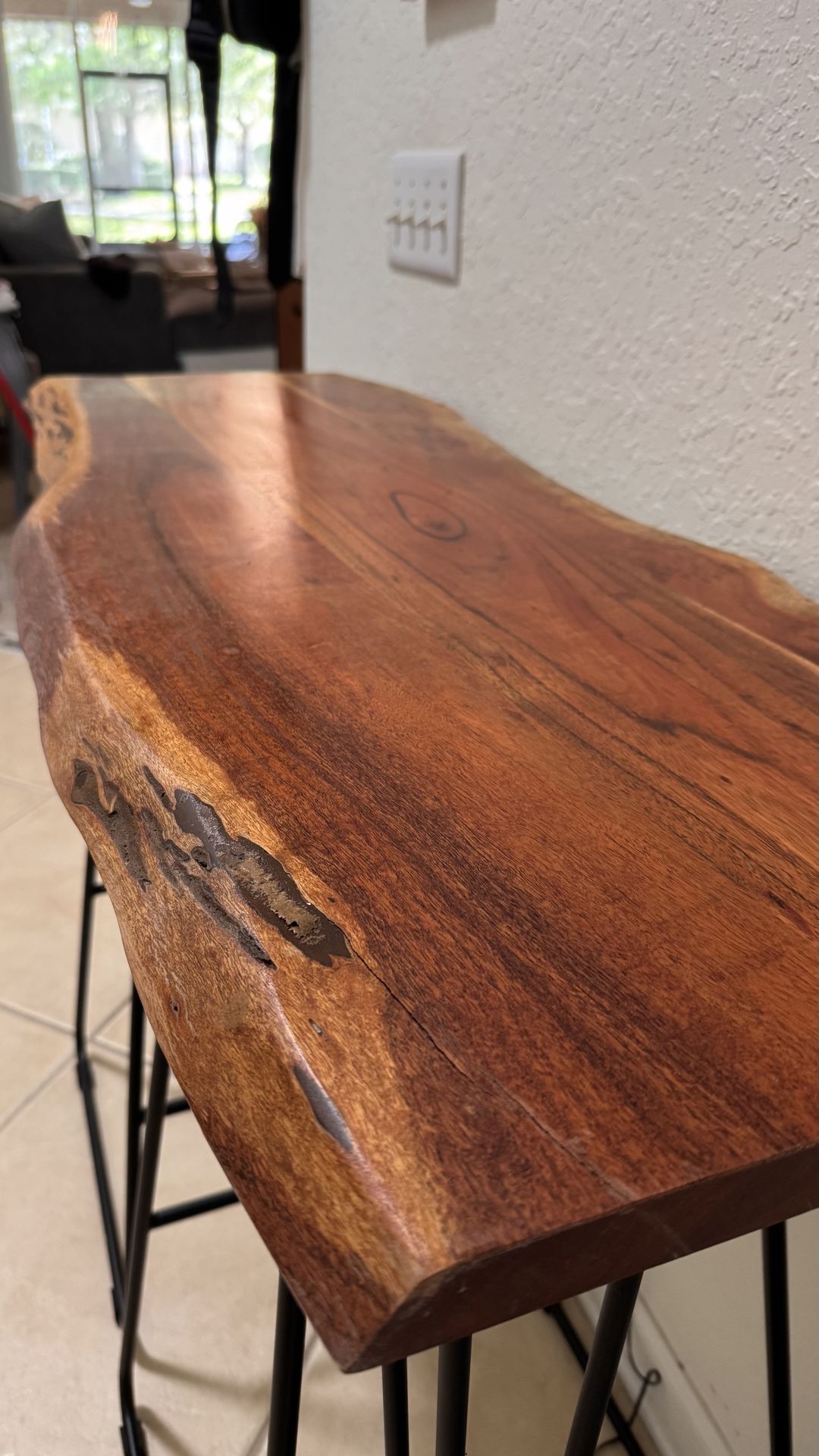 Selling this beautiful, unique Live Edge wood console table. It features a solid wood top with rich natural grain and elegant black hairpin legs. It’s the perfect accent piece for an entryway, hallway, or behind a sofa. The table is in excellent condition and adds a warm, rustic-modern touch to any room. Key Features: • Design: Authentic Live Edge top (each piece is one-of-a-kind). • Style: Industrial / Mid-Century Modern. • Legs: Sturdy black metal hairpin legs. • Condition: Great condition, well-maintained. • Versatility: Slim profile, perfect for narrow spaces like entryways or halls. Pick up: Orlando
