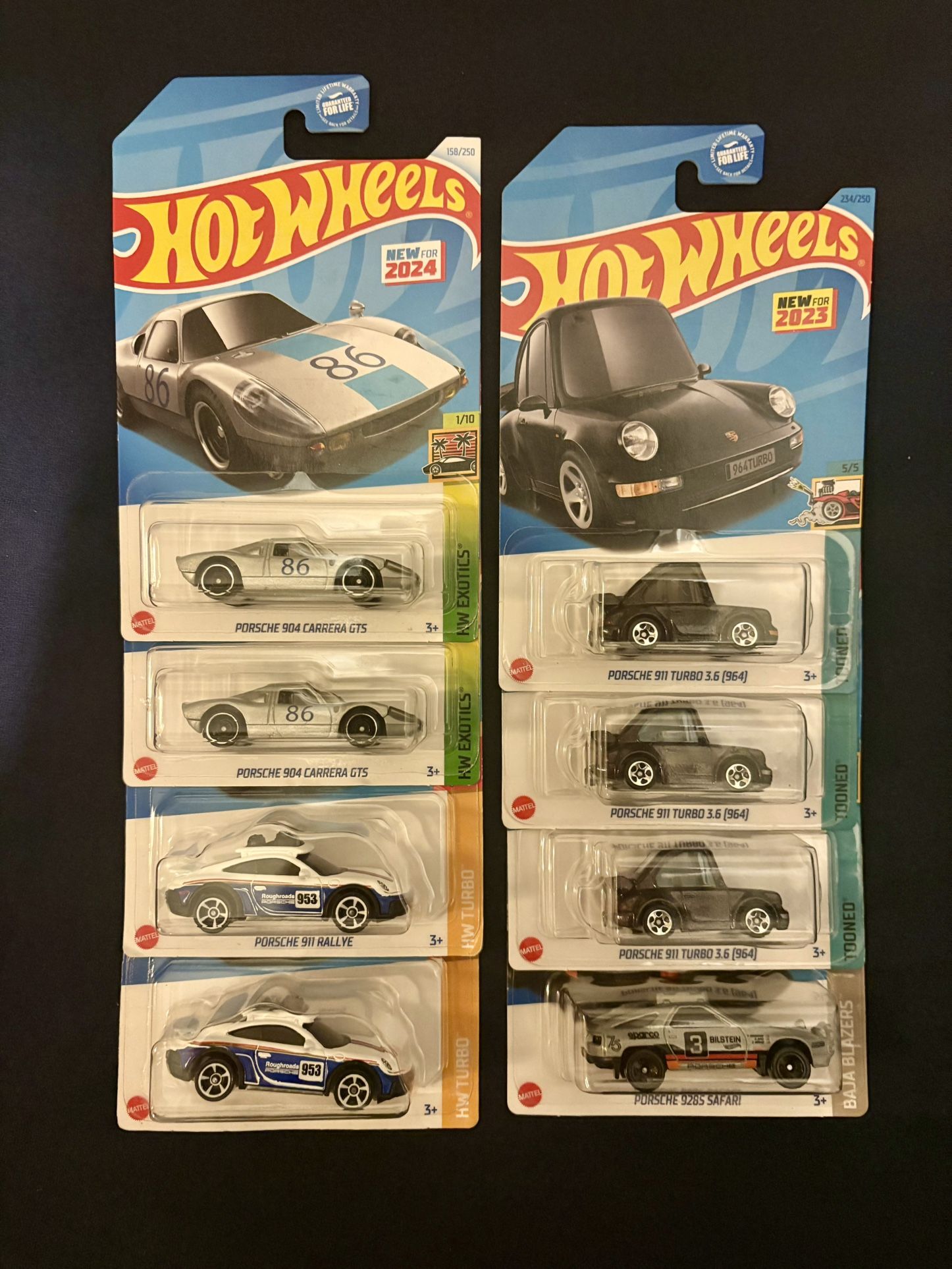 Price is $3 for each Porsche. 2- Porsche 904 Carrera GTS, silver, 2- Porsche 911 Rallye, blue & white, - Porsche 911 Turbo 3.6 (964), black, 2- Porsche 911 Turbo 3.6 (964), dark purple, - Porsche 928S Safari, gray