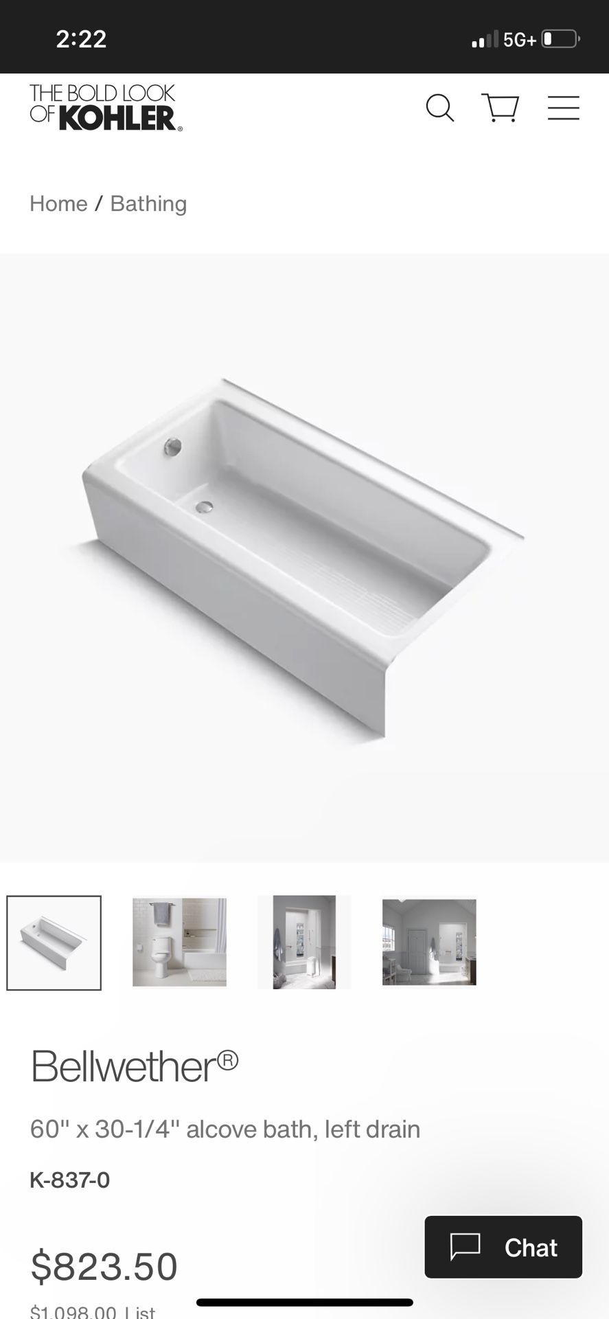 Brand new kohler 60x30 Bellwether Left draining tub with slip resistant