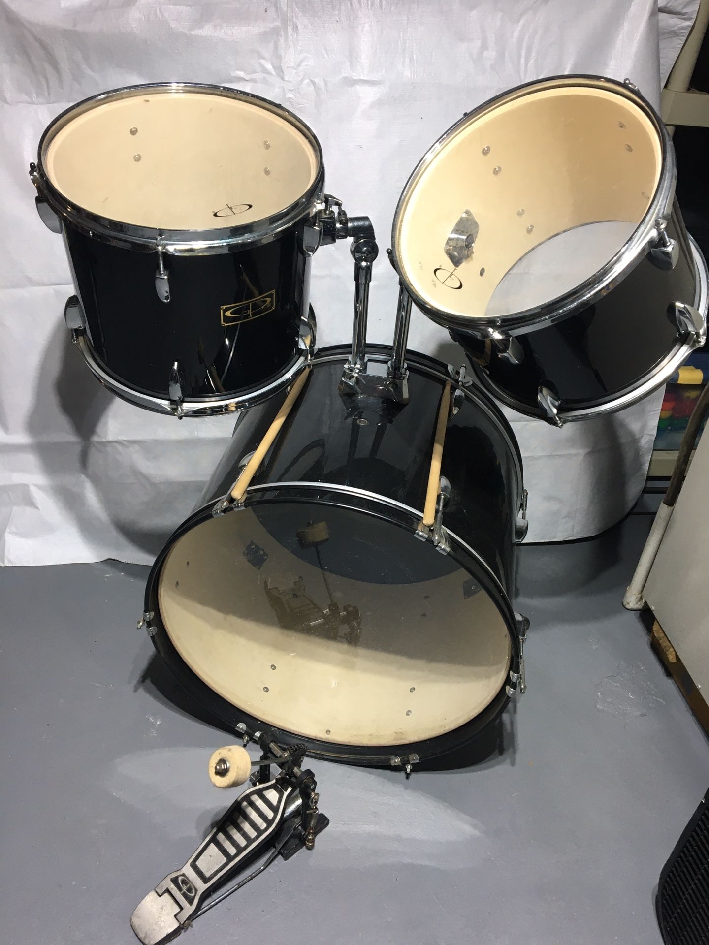 GP drum set . Bass drum, 2 small Tom head drums, one large Tom head drum, 1 snare drum, 2 cymbals with stands, leather stool, and 2 foot pedals. Buyer must pick up in Wildwood or eureka area. Instruction manual. Also included us a drum training dvd kit.