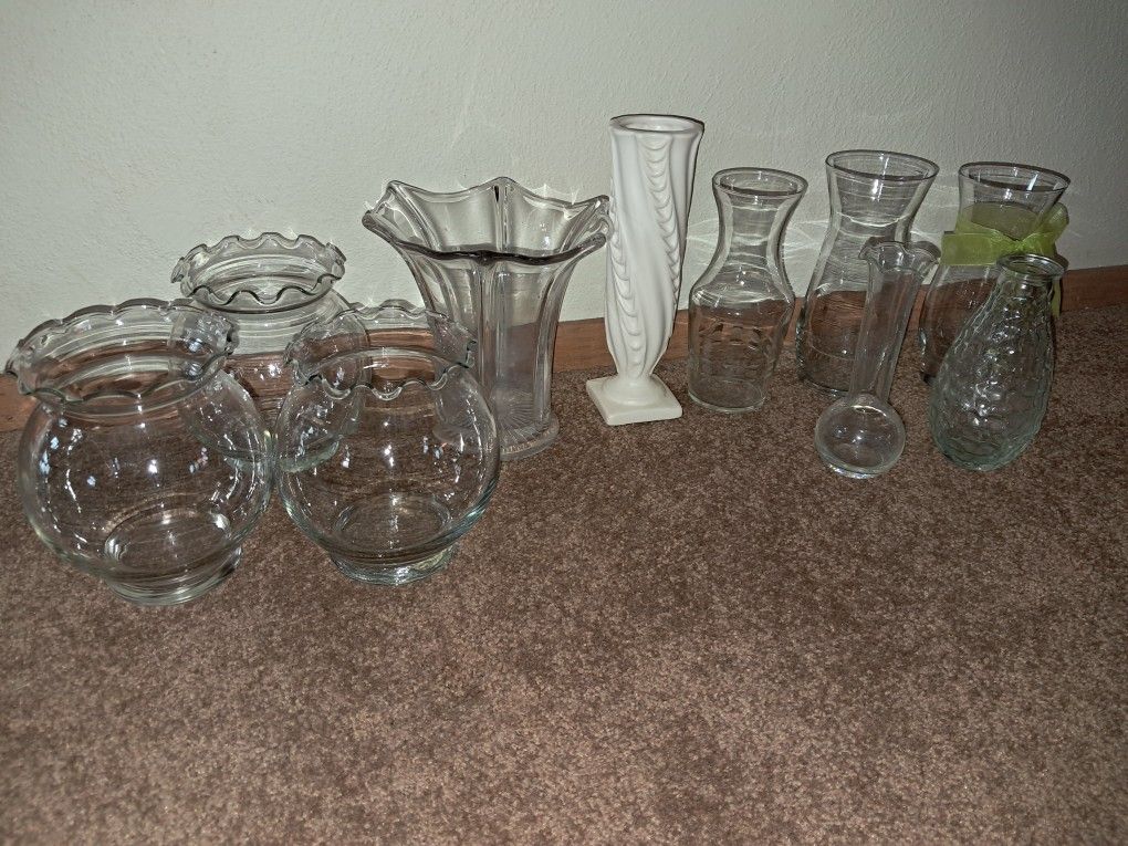 Assorted vases: -3 Fluted rose bowls-5.5"H x 5" W -Art Deco twisted scalloped body with a square footed base-8" H -Vintage clear glass flared flower vase-6.5" -3 Hurricane shaped vases, one with an etched pattern, one clear & one with a ribbon -Transpac clear glass, bumpy vase-5.75" H -Clear bud vase with ball base & ruffled rim-6" All 10 vases for $25 total