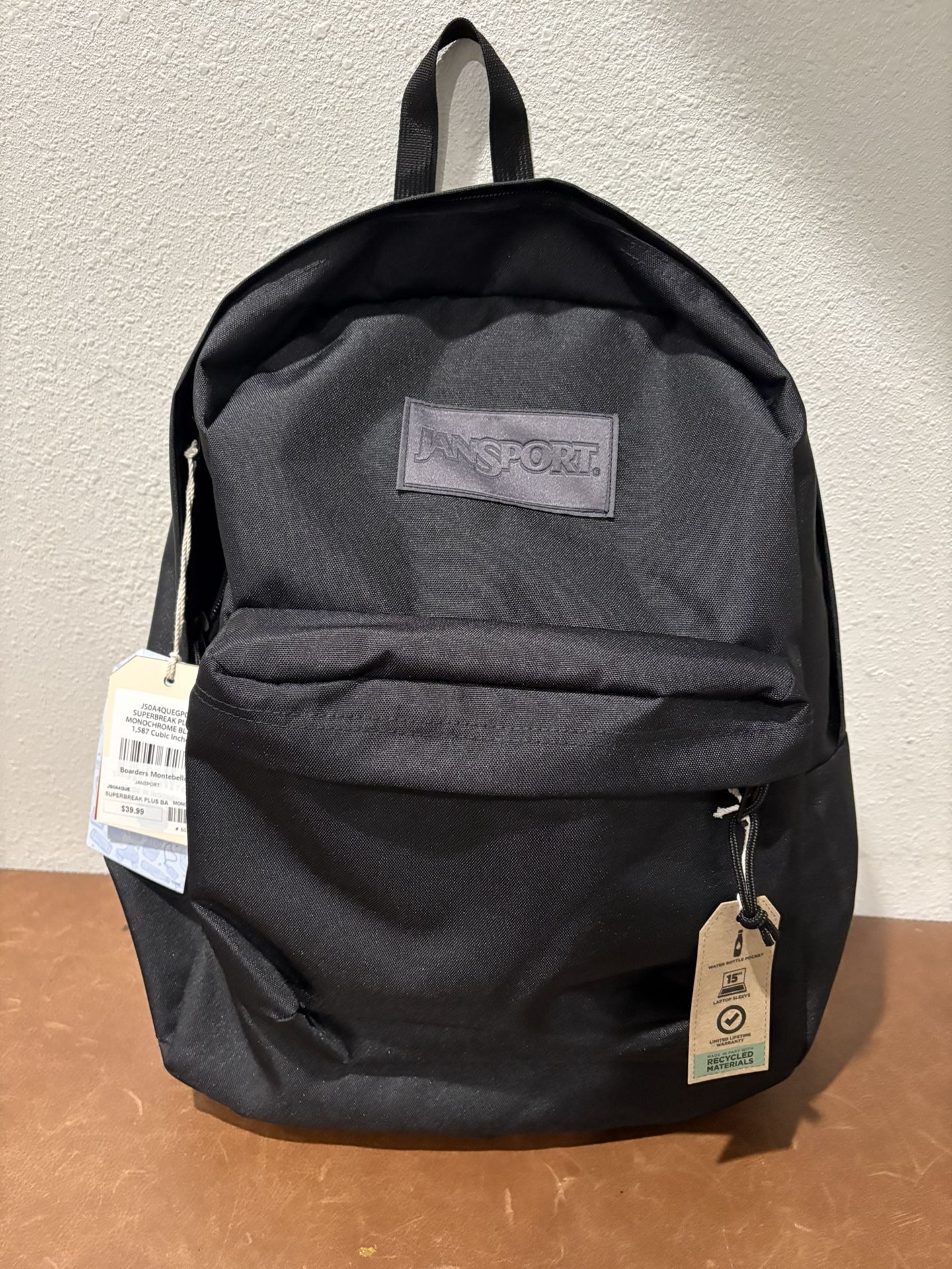 Brand: Jansport Color: Monochrome Black Condition: New Capacity/space: 1,587 cubic inches This backpack also includes a 15” laptop sleeve and water bottle pocket. Purchase it today!