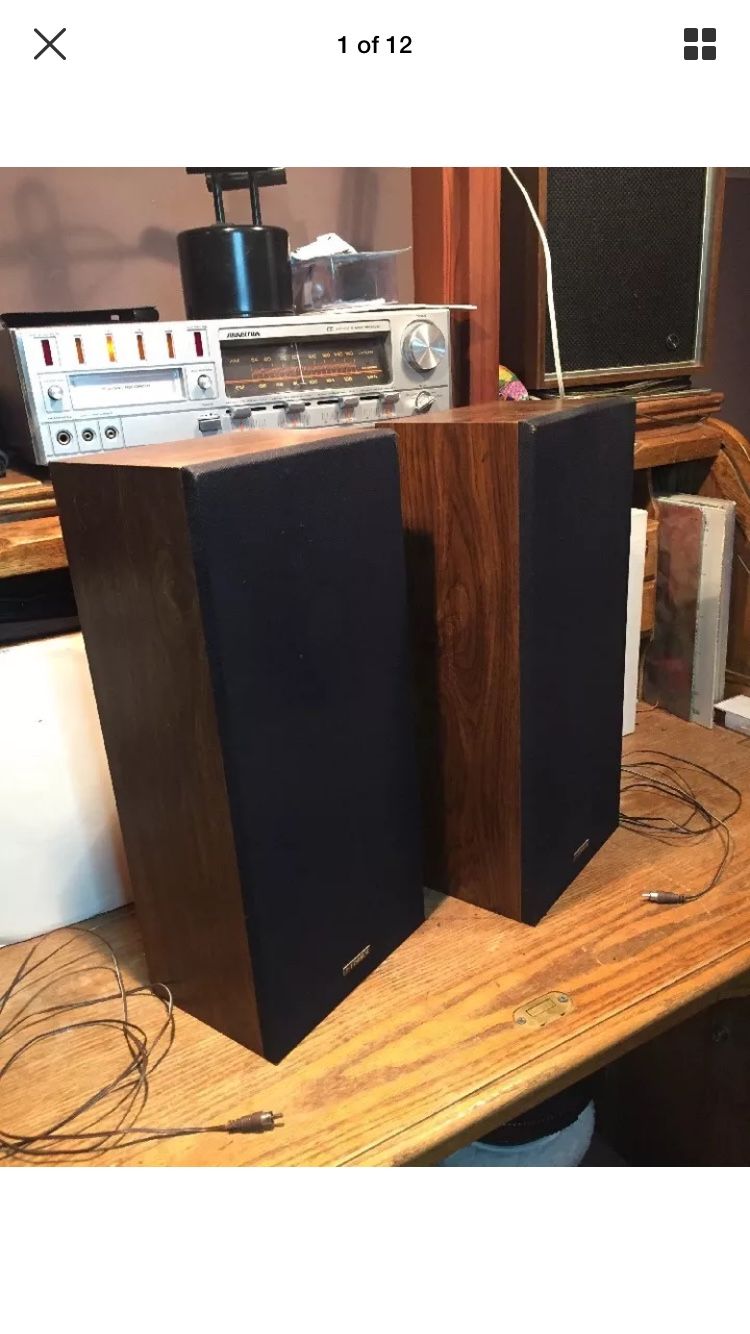 This is a very nice pair of vintage Fisher MS-107 speakers. These are excellent speakers with a fantastic vintage sound that sounds great with vinyl as well as with all kinds of music. They have a warmer relaxed tone to them. They have attached cables that end in rca connections. The cables are in perfect condition with no issues. The speakers are also in excellent condition with only some minor signs of wear. The grills have only some minor fraying and snagging. Overall the speakers are fully functional and sound incredible!