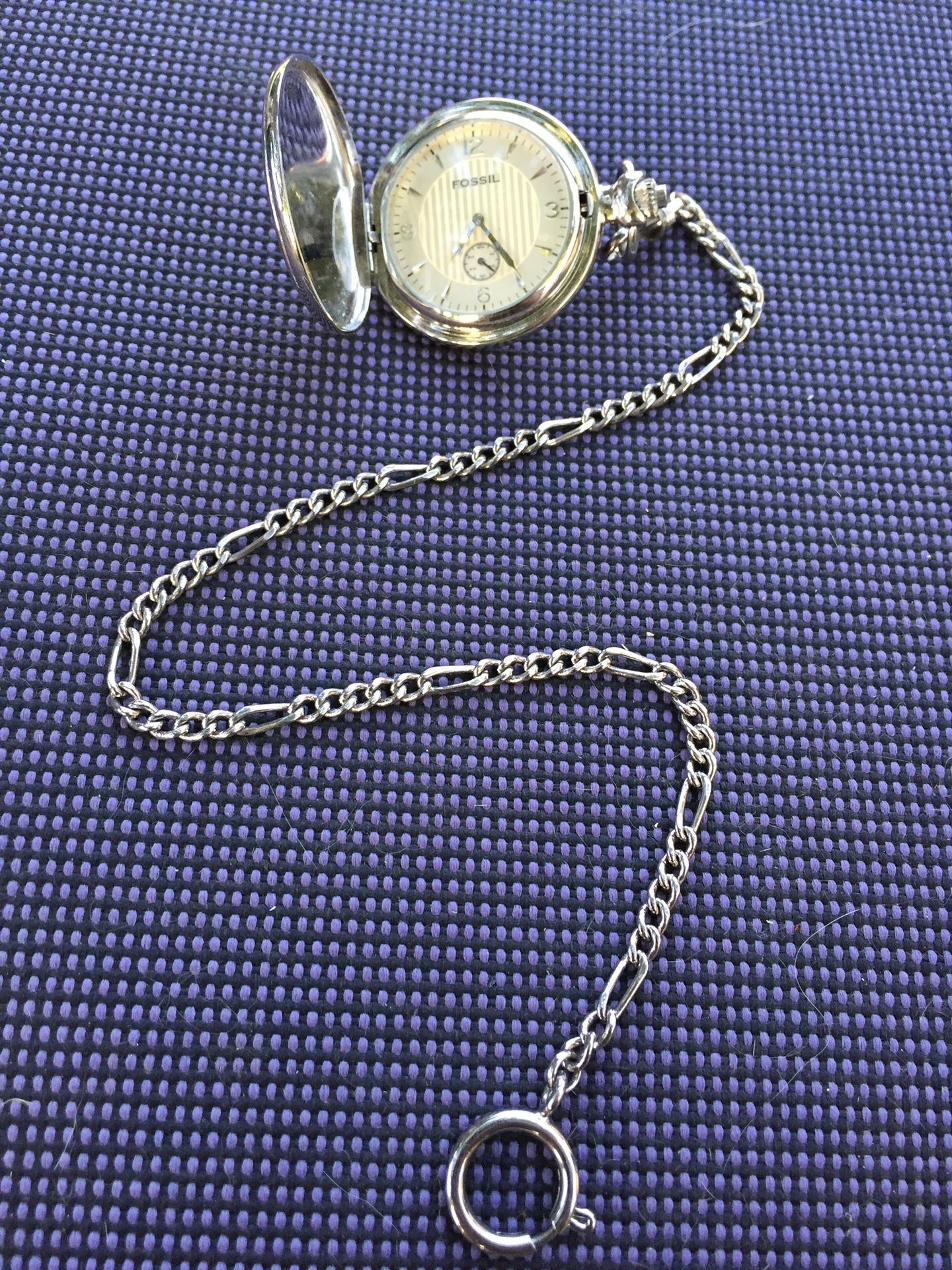Fossil brand pocket watch comes with its own chain. Stainless steel case and chain, 40mm case with champagne color textured face and smaller second counter at 6 position. No water resistance, some light wear on the case. Looks great with a vest!