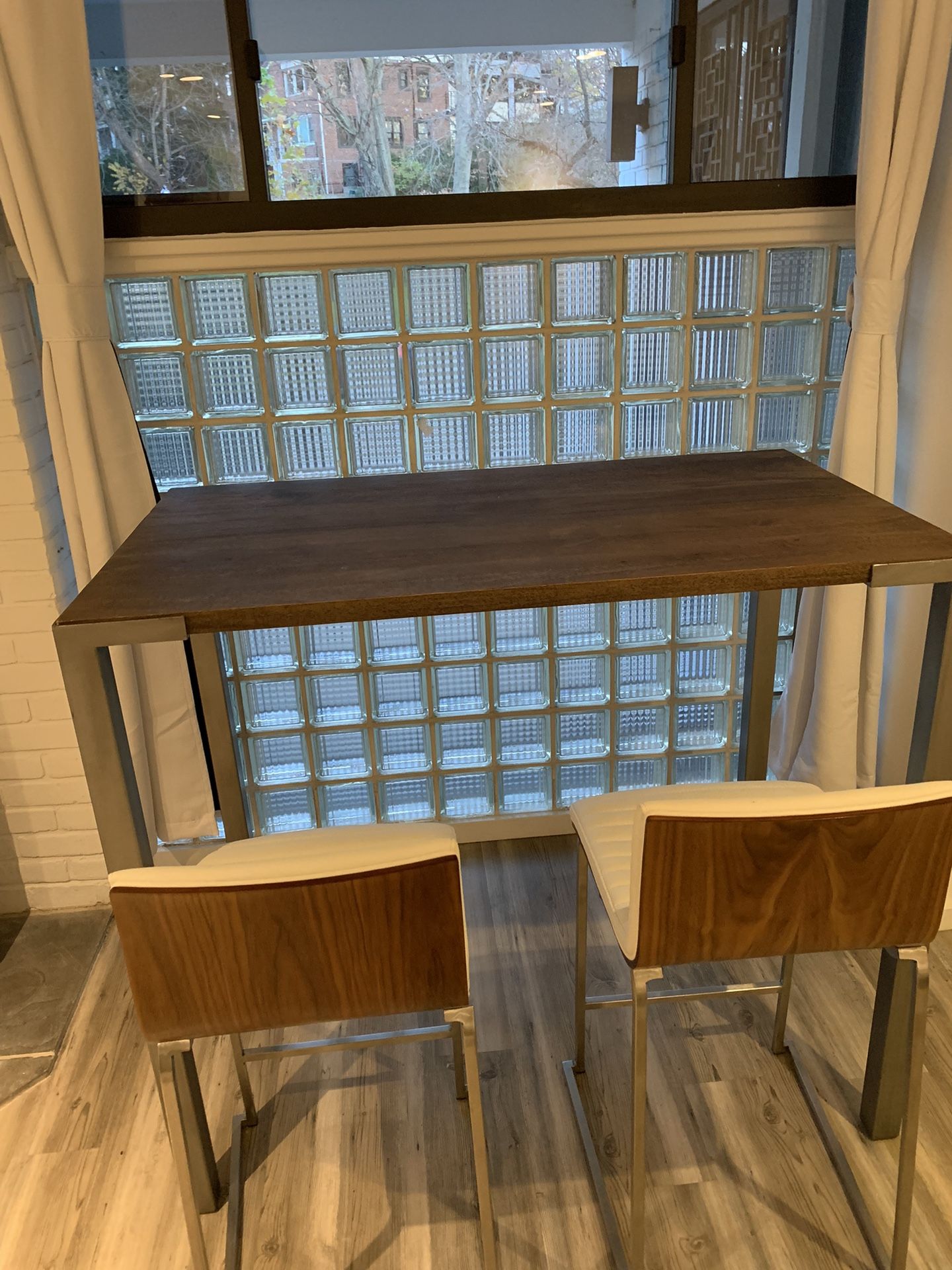 CB2 barely used in fantastic condition midtone brown that reveals sweeping wood grain. Hi-dines four, tends bar, takes meetings. stilt 42 high dining table is a CB2 exclusive. Dimensions: 49" W x 42" H x 28" D