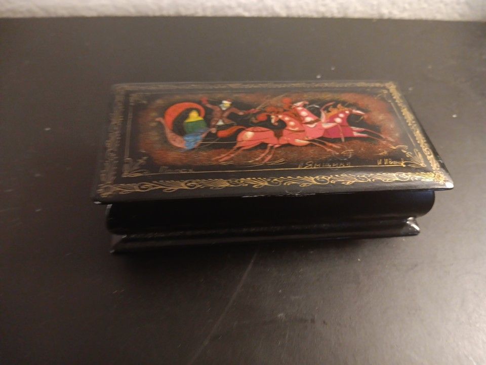 GORGEOUS VTG 5" Russian Fairy Tale Lacquer Felt Lined Trinket Box. This stunning vintage Russian fairy tale lacquer trinket box is a true work of art. Its intricate design and exquisite craftsmanship make it a must-have collectible for any admirer of Russian culture and folklore. Measuring 5 inches in size, it is the perfect size to store your precious jewelry, small trinkets, or keepsakes. The felt-lined interior of the box ensures that your items are kept safe and protected, while the beautiful lacquer finish adds a touch of elegance to any room. Whether you are an avid collector or simply appreciate the beauty of Russian art and culture, this trinket box is sure to impress. BOX 22