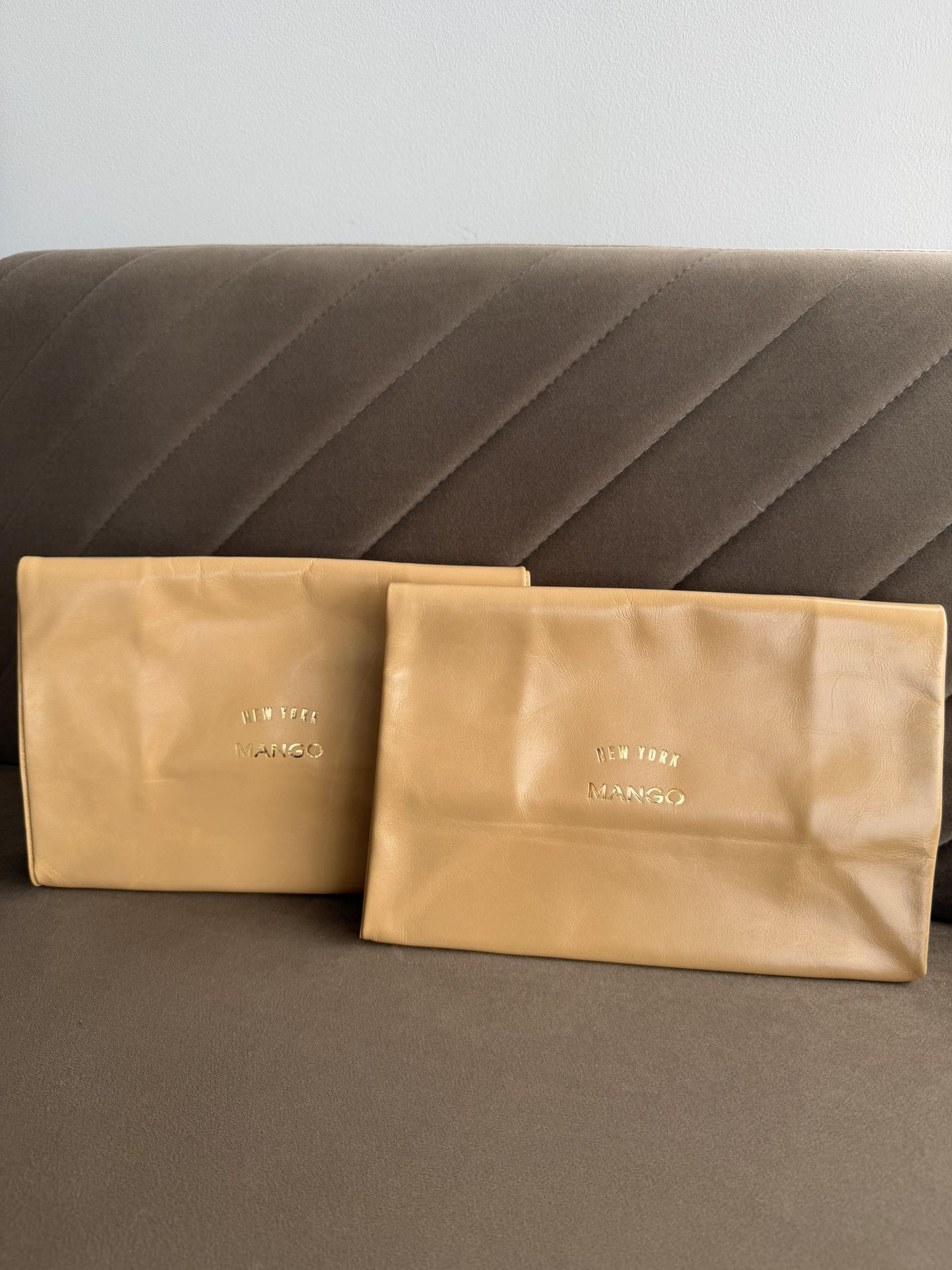 Selling a set of two Mango New York leather paper bag clutches in camel/tan. Great condition. - Mango leather bags retail $60-100+ each - Soft leather paper bag silhouette — trending minimalist style - Gold embossed “New York / Mango” branding - Versatile camel color — goes with everything - Great for evenings out, travel, or everyday use - Smoke-free home Clearing out before a move. Cash or Venmo. Pickup in Murray Hill. DM if interested!