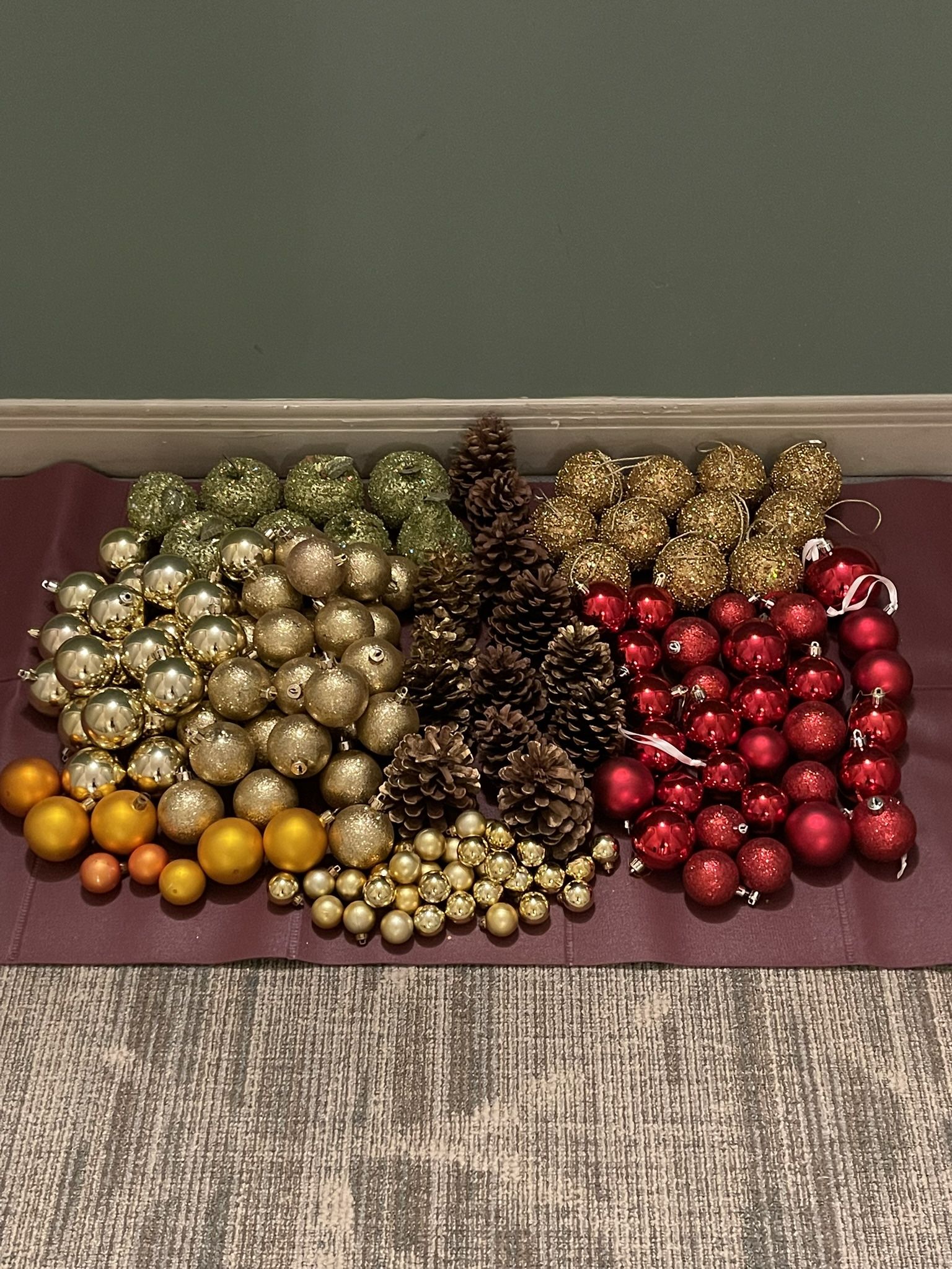 150 Holiday Tree & Table ORNAMENTS + 12 gal. Storage Crate. Includes the following: 13 Real PINE CONES 11 Large, Beaded, GOLDEN TREE ORNAMENTS w/hanging string attached 31 RED TREE ORNAMENTS (various sizes & finish) 33 Small GOLDEN TREE ORNAMENTS 8 DARK GOLDEN TREE ORNAMENTS 28 SPARKLE GOLDEN TREE ORNAMENTS 22 SHINY GOLDEN TREE ORNAMENTS 8 LARGE, BEADED, fruit-shaped, GLITTER TABLE ORNAMENTS Plus 12-Gallon Storage Crate PRICE: $30 (firm). CASH only. PICKUP only. Thank you!!