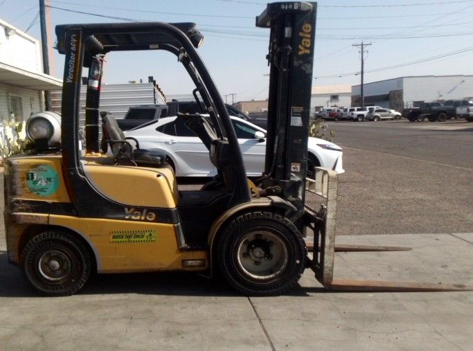 2013 Yale GLP060VXNVSE093 Forklift for Sale in Phoenix, AZ. Three-stage mast - 198" (16.5 feet) max fork lift height, sideshifter with tilt functions, 6000lb base capacity, pneumatic tires, propane fuel, 42" forks, load back rest, lever-shift automatic. This Yale lift truck is in good working condition. Available for purchase.